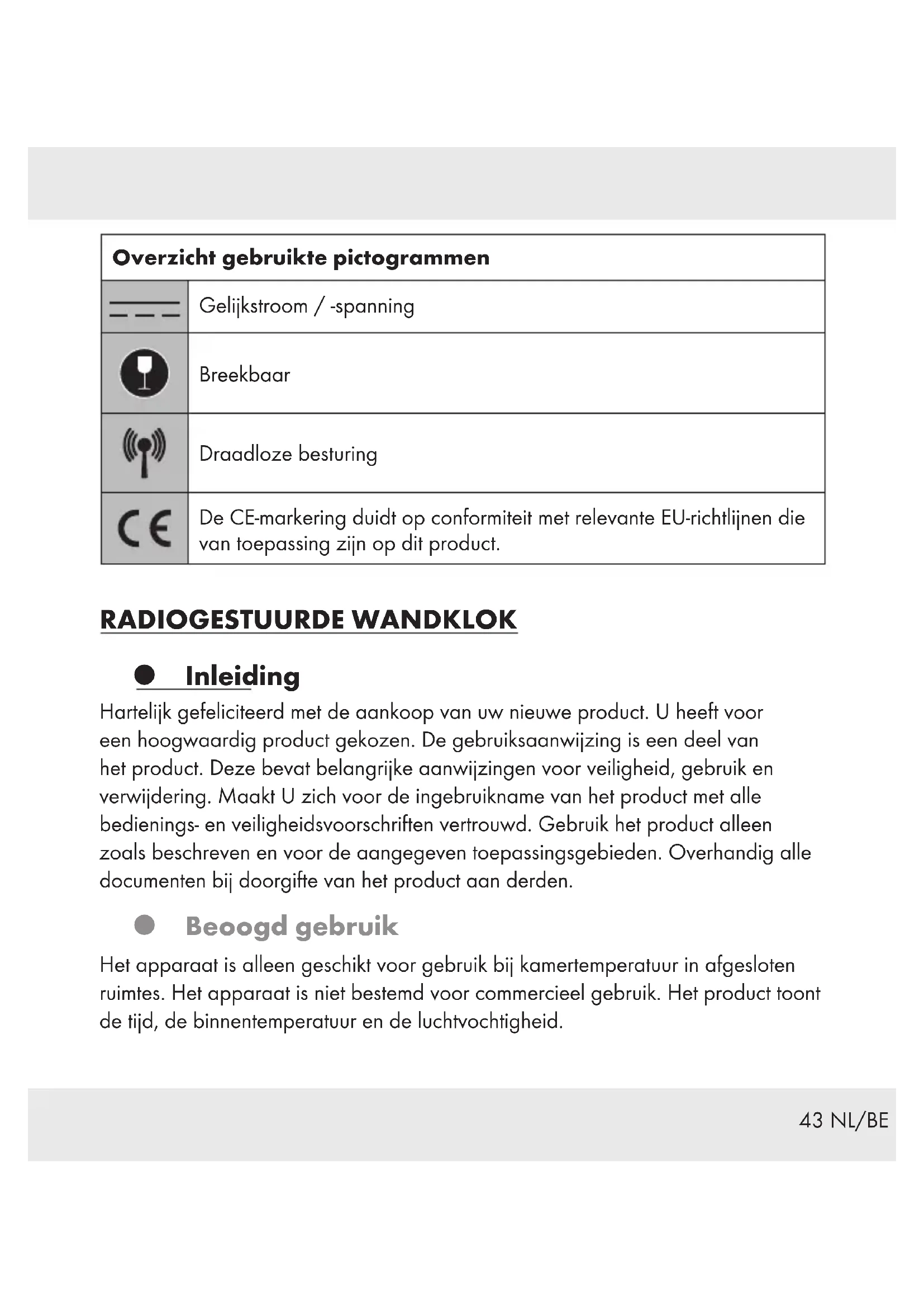 Het apparaat is alleen geschikt voor gebruik bij kamertemperatuur in afgesloten ruimtes. Het apparaat is Niet bestemd voor commercieel gebruik. Het product toont de tijd, de binnentemperatuur en de luchtvochtigheid.