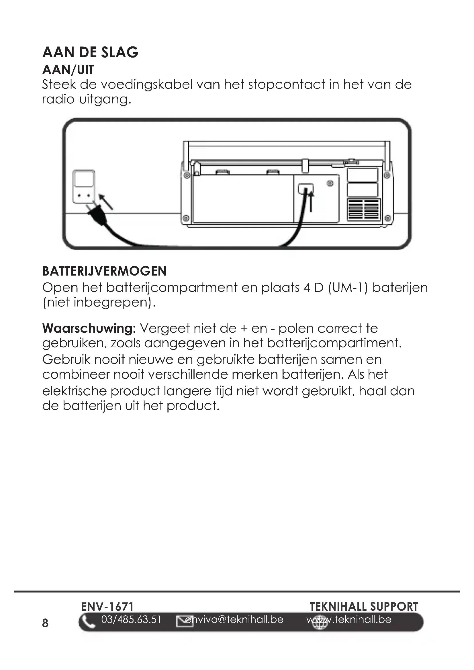 AAN/UIT Steek de voedingskabel van het stopcontact in het van de radio-uitgang. BATTERIJVERMOGEN Open het batterijcompartment en plaats 4 D (UM-1) baterijen (niet inbegrepen). Waarschuwing: Vergeet niet de + en - polen correct te gebruiken, zoals aangegeven in het batterijcompartiment. Gebruik nooit nieuwe en gebruikte batterijen samen en combineer nooit verschillende merken batterijen. Als het elektrische product langere tijd niet wordt gebruikt, haal dan de batterijen uit het product.ENV-1671