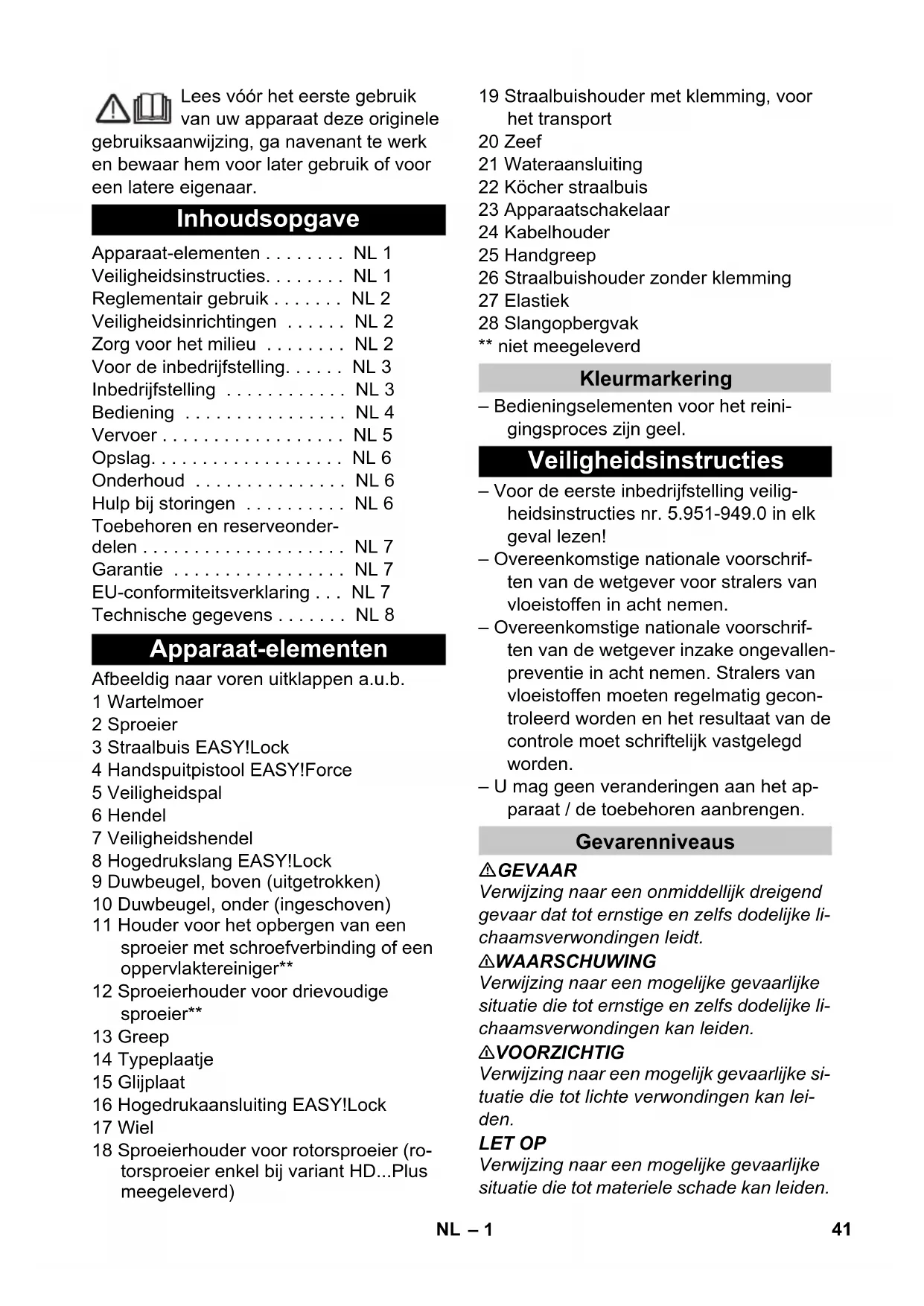dB(A) 89 Dimensioni e pesi Lunghezza mm 351 Larghezza mm 312 Altezza mm 904 Peso d'esercizio tipico kg 20,5 40 IT– 1 Lees vóór het eerste gebruik van uw apparaat deze originele gebruiksaanwijzing, ga navenant te werk en bewaar hem voor later gebruik of voor een latere eigenaar. Afbeeldig naar voren uitklappen a.u.b. 1 Wartelmoer 2 Sproeier 3 Straalbuis EASY!Lock 4 Handspuitpistool EASY!Force 5 Veiligheidspal 6 Hendel 7 Veiligheidshendel 8 Hogedrukslang EASY!Lock 9 Duwbeugel, boven (uitgetrokken) 10 Duwbeugel, onder (ingeschoven) 11 Houder voor het opbergen van een sproeier met schroefverbinding of een oppervlaktereiniger** 12 Sproeierhouder voor drievoudige sproeier** 13 Greep 14 Typeplaatje 15 Glijplaat 16 Hogedrukaansluiting EASY!Lock 17 Wiel 18 Sproeierhouder voor rotorsproeier (ro- torsproeier enkel bij variant HD...Plus meegeleverd) 19 Straalbuishouder met klemming, voor het transport 20 Zeef 21 Wateraansluiting 22 Köcher straalbuis 23 Apparaatschakelaar 24 Kabelhouder 25 Handgreep 26 Straalbuishouder zonder klemming 27 Elastiek 28 Slangopbergvak ** niet meegeleverd – Bedieningselementen voor het reini- gingsproces zijn geel. – Voor de eerste inbedrijfstelling veilig- heidsinstructies nr. 5.951-949.0 in elk geval lezen! – Overeenkomstige nationale voorschrif- ten van de wetgever voor stralers van vloeistoffen in acht nemen. – Overeenkomstige nationale voorschrif- ten van de wetgever inzake ongevallen- preventie in acht nemen. Stralers van vloeistoffen moeten regelmatig gecon- troleerd worden en het resultaat van de controle moet schriftelijk vastgelegd worden. – U mag geen veranderingen aan het ap- paraat / de toebehoren aanbrengen. GEVAAR Verwijzing naar een onmiddellijk dreigend gevaar dat tot ernstige en zelfs dodelijke li- chaamsverwondingen leidt. 몇 WAARSCHUWING Verwijzing naar een mogelijke gevaarlijke situatie die tot ernstige en zelfs dodelijke li- chaamsverwondingen kan leiden. 몇 VOORZICHTIG Verwijzing naar een mogelijk gevaarlijke si- tuatie die tot lichte verwondingen kan lei- den. LET OP Verwijzing naar een mogelijke gevaarlijke situatie die tot materiele schade kan leiden. Inhoudsopgave Apparaat-elementen . . . . . . . . NL 1 Veiligheidsinstructies. . . . . . . . NL 1 Reglementair gebruik . . . . . . . NL 2 Veiligheidsinrichtingen . . . . . . NL 2 Zorg voor het milieu . . . . . . . . NL 2 Voor de inbedrijfstelling. . . . . . NL 3 Inbedrijfstelling . . . . . . . . . . . . NL 3 Bediening . . . . . . . . . . . . . . . . NL 4 Vervoer . . . . . . . . . . . . . . . . . . NL 5 Opslag. . . . . . . . . . . . . . . . . . . NL 6 Onderhoud . . . . . . . . . . . . . . . NL 6 Hulp bij storingen . . . . . . . . . . NL 6 Toebehoren en reserveonder- delen . . . . . . . . . . . . . . . . . . . . NL 7 Garantie . . . . . . . . . . . . . . . . . NL 7 EU-conformiteitsverklaring . . . NL 7 Technische gegevens . . . . . . . NL 8 Apparaat-elementen Kleurmarkering Veiligheidsinstructies Gevarenniveaus 41NL– 2 Bij ondeskundig gebruik kunnen hogedrukstralen gevaarlijk zijn. De straal mag niet op personen, dieren, actieve elektrische uitrusting of het apparaat zelf gericht worden. Conform de geldige voorschriften mag het apparaat nooit zonder sy- steemscheider aan het drinkwater- net gebruikt worden. Er moet een geschikte systeemscheider van de firma KÄRCHER of alternatief een systeem- scheider conform EN 12729 type BA ge- bruikt worden. Water dat door een systeemscheider is ge- stroomd, wordt als niet-drinkbaar be- schouwd. Deze hogedrukreiniger uitsluitend gebrui- ken – voor het reinigen met hogedrukstraal (bv. reinigen van gevels, terrassen, tuintoestellen). Met optionele toebehoren kan reinigings- middel toegevoegd worden. Voor hardnekkig vuil raden wij een rotor- sproeier aan (enkel bij variant HD...Plus meegeleverd). Eisen aan de waterkwaliteit: LET OP Als hogedrukmedium mag uitsluitend schoon water worden gebruikt. Verontreini- gingen geven aanleiding tot vroegtijdige slijtage of afzettingen in het apparaat. Als gerecycleerd water wordt gebruikt, mo- gen de volgende grenswaarden niet over- schreden worden. Veiligheidsinrichtingen dienen voor de be- scherming van de gebruiker en mogen niet buiten werking gezet of in hun functie om- zeild worden. Als de bedieningshendel aan het hand- spuitpistool losgelaten wordt, schakelt de drukschakelaar de pomp uit, de hogedruk- straal stopt. Als de bedieningshendel aan- getrokken wordt, schakelt de pomp op- nieuw in. Symbolen op het apparaat Reglementair gebruik pH-waarde 6,5...9,5 elektrische geleidbaarheid