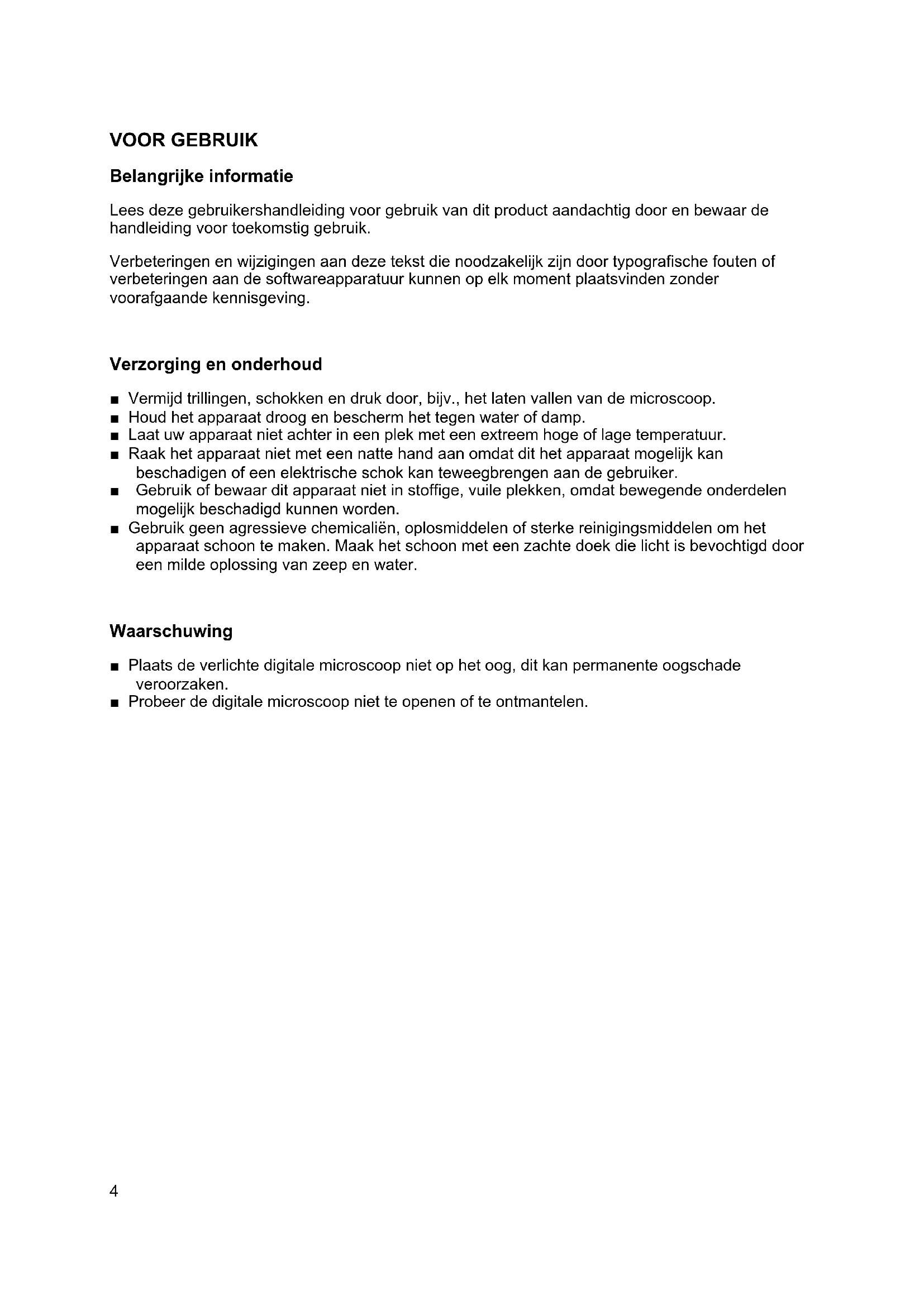 Geavanceerde instellingen ............................................................................................................. 22 Opgeslagen bestanden ................................................................................................................... 23 Verwijderen van de software xploview ............................................................................................ 234 VOOR GEBRUIK Belangrijke informatie Lees deze gebruikershandleiding voor gebruik van dit product aandachtig door en bewaar de handleiding voor toekomstig gebruik. Verbeteringen en wijzigingen aan deze tekst die noodzakelijk zijn door typografische fouten of verbeteringen aan de softwareapparatuur kunnen op elk moment plaatsvinden zonder voorafgaande kennisgeving. Verzorging en onderhoud ■ Vermijd trillingen, schokken en druk door, bijv., het laten vallen van de microscoop. ■ Houd het apparaat droog en bescherm het tegen water of damp. ■ Laat uw apparaat niet achter in een plek met een extreem hoge of lage temperatuur. ■ Raak het apparaat niet met een natte hand aan omdat dit het apparaat mogelijk kan beschadigen of een elektrische schok kan teweegbrengen aan de gebruiker. ■ Gebruik of bewaar dit apparaat niet in stoffige, vuile plekken, omdat bewegende onderdelen mogelijk beschadigd kunnen worden. ■ Gebruik geen agressieve chemicaliën, oplosmiddelen of sterke reinigingsmiddelen om het apparaat schoon te maken. Maak het schoon met een zachte doek die licht is bevochtigd door een milde oplossing van zeep en water. Waarschuwing ■ Plaats de verlichte digitale microscoop niet op het oog, dit kan permanente oogschade veroorzaken. ■ Probeer de digitale microscoop niet te openen of te ontmantelen.5 Productbeschrijving ■ Deze digitale microscoop verschilt van een traditionele optische microscoop waarbij je door een oculair kijkt, door de weergave van een vergrote afbeelding of live video op een computerbeeldscherm via een USB-aansluiting. ■ Deze apparaat heeft 2 vergrotingscapaciteiten en kan afbeeldingen tot 60x en 250x vergroten wanneer deze direct op het object worden geplaatst met een 17" beeldscherm. De vergrotingsfactor is afhankelijk van de grootte van het gebruikte beeldscherm - des te groter het beeldscherm, des te hoger de vergroting. ■ Het apparaat heeft 4 LED-lichten waarbij de intensiteit kan worden aangepast. Computervereisten Op Windows gebaseerde PC Compatibele besturingssystemen Windows 10 (32 bit of 64 bit) Windows 8 (32 bit of 64 bit) Windows 7 (32 bit of 64 bit) Windows Vista (32 bit of 64 bit) Windows XP SP2, SP3 USB USB 2.0 Mac OS gebaseerde PC Compatibele besturingssystemen Mac OS X 10.5.6 - Mac OS X 10.11.x USB USB 2.06