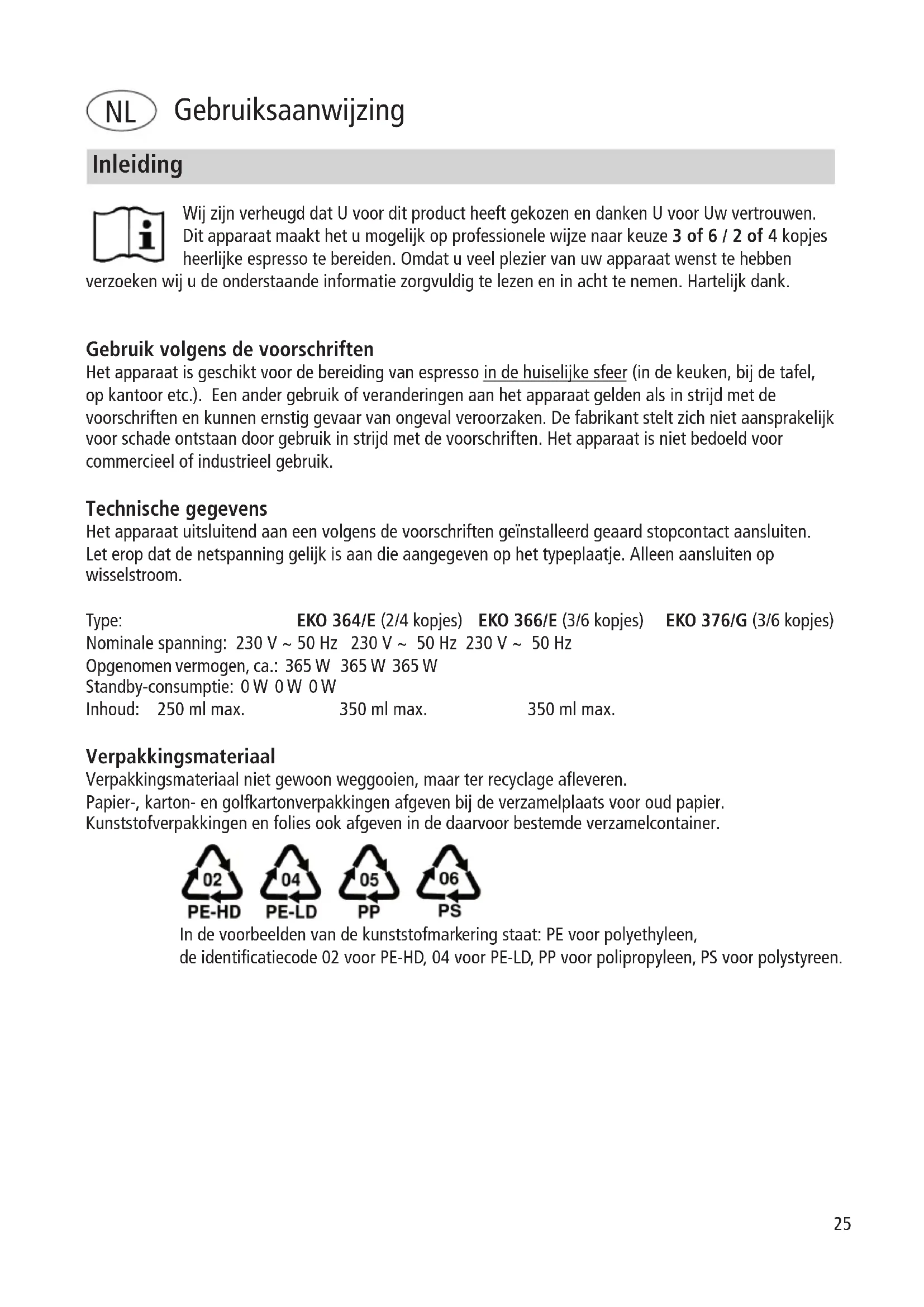 Inleiding Wij zijn verheugd dat U voor dit product heeft gekozen en danken U voor Uw vertrouwen. Dit apparaat maakt het u mogelijk op professionele wijze naar keuze 3 of 6 / 2 of 4 kopjes heerlijke espresso te bereiden. Omdat u veel plezier van uw apparaat wenst te hebben verzoeken wij u de onderstaande informatie zorgvuldig te lezen en in acht te nemen. Hartelijk dank. Gebruik volgens de voorschriften Het apparaat is geschikt voor de bereiding van espresso in de huiselijke sfeer (in de keuken, bij de tafel, op kantoor etc.). Een ander gebruik of veranderingen aan het apparaat gelden als in strijd met de voorschriften en kunnen ernstig gevaar van ongeval veroorzaken. De fabrikant stelt zich niet aansprakelijk voor schade ontstaan door gebruik in strijd met de voorschriften. Het apparaat is niet bedoeld voor commercieel of industrieel gebruik. Technische gegevens Het apparaat uitsluitend aan een volgens de voorschriften geïnstalleerd geaard stopcontact aansluiten. Let erop dat de netspanning gelijk is aan die aangegeven op het typeplaatje. Alleen aansluiten op wisselstroom. Type: EKO 364/E (2/4 kopjes) EKO 366/E (3/6 kopjes) EKO 376/G (3/6 kopjes) Nominale spanning: 230 V ~ 50 Hz 230 V ~ 50 Hz 230 V ~ 50 Hz Opgenomen vermogen, ca.: 365 W 365 W 365 W Standby-consumptie: 0 W 0 W 0 W Inhoud: 250 ml max. 350 ml max. 350 ml max. Verpakkingsmateriaal Verpakkingsmateriaal niet gewoon weggooien, maar ter recyclage afl everen. Papier-, karton- en golfkartonverpakkingen afgeven bij de verzamelplaats voor oud papier. Kunststofverpakkingen en folies ook afgeven in de daarvoor bestemde verzamelcontainer. In de voorbeelden van de kunststofmarkering staat: PE voor polyethyleen, de identifi catiecode 02 voor PE-HD, 04 voor PE-LD, PP voor polipropyleen, PS voor polystyreen.26 Voor uw veiligheid OPGELET. Lees alle veiligheidsinstructies en aanwijzingen. Verzuim bij het nakomen van de veiligheidsinstructies en aanwijzingen kunnen elektrische schok, brand en/of ernstig letsel veroorzaken! Algemene veiligheidsinstructies: