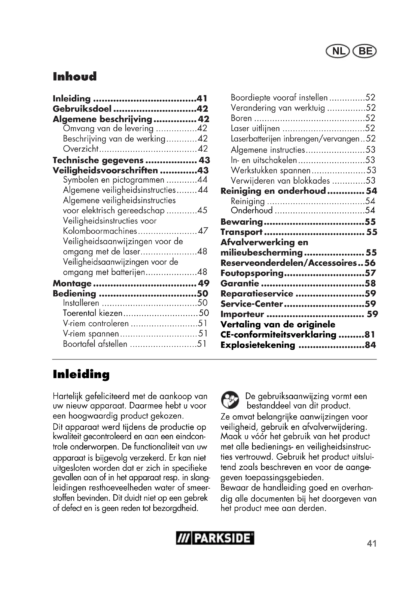 - Boortafel afstellen NL BE Gebruiksdoel De tafelboormachine is bestemd voor het boren in metaal, hout, kunststof en tegels. Hiervoor kunnen boren met cilindrische schacht en een boordiameter van 1,5 mm tot 16 mm worden gebruikt. Het apparaat is bedoeld voor doe-het- zelvers. Het werd niet ontworpen voor professioneel continu gebruik. Het apparaat is niet bestemd voor gebruik door personen jonger dan 16. Jongeren ouder dan 16 jaar mogen het apparaat alleen onder toezicht gebruiken. De fabrikant is niet aansprakelijk voor schade, die wordt veroorzaakt door ver- keerd gebruik of een verkeerde hantering. Algemene beschrijving De afbeeldingen vindt u op de voorste en achterste uitklapbare bladzijde. Omvang van de levering Pak het apparaat uit en controleer, of de inhoud volledig is. Zorg voor een regle- mentair voorgeschreven afvalverwijdering van het verpakkingsmateriaal. - Bodemplaat - Boortafel - Kolombuis - Motorunit - 3 boorhefarmen - Beschermkap - Boorhouder - Boorhoudersleutel - Inbussleutel - Bankschroef - 2 x 1,5 V batterijen, formaat AAA - Montagemateriaal - Gebruiksaanwijzing Beschrijving van de werking De werking van de verschillende bedienings- elementen wordt hieronder beschreven. Overzicht p. 5142