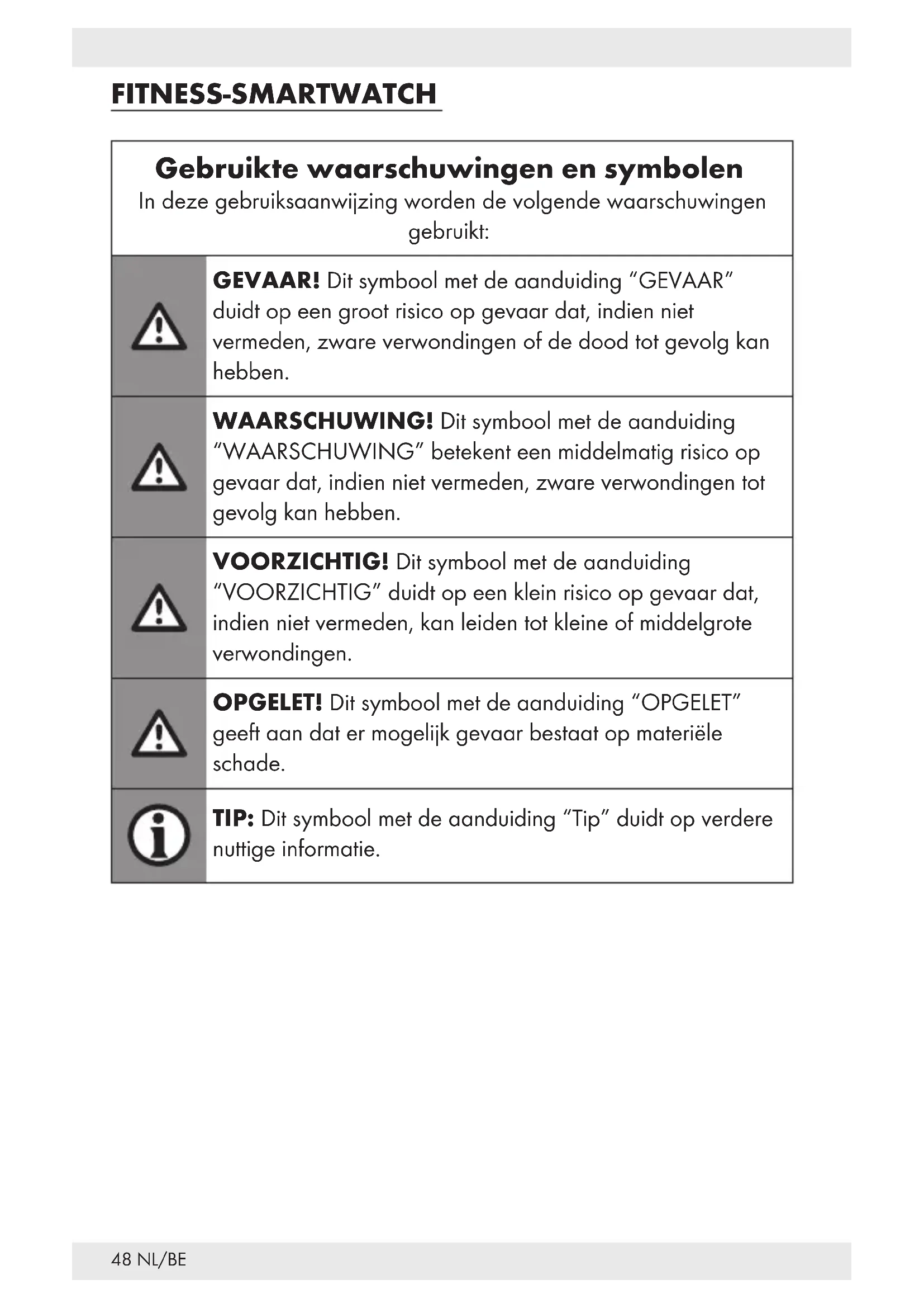 GEBRUIKT! ALS U DIT PRODUCT AAN IEMAND ANDERS DOORGEEFT, GEEF DAN OOK ALLE DOCUMENTATIE MEE! In geval van schade door het niet de hand houden aan deze gebruiksaanwijzing vervalt uw garantieaanspraak! Wij zijn niet aansprakelijk voor gevolgschade! Wij zijn niet aansprakelijk voor materiële schade of lichamelijk letsel ontstaan door onjuist gebruik of niet-naleving van de veiligheidstips! Vóór ieder gebruik: Controleer het product op mogelijke schade. Gebruik het product nooit als het is beschadigd. Dit product mag door kinderen vanaf 8jaar alsmede door personen met verminderde fysieke, sensorische of geestelijke vermogens of gebrek aan ervaring en kennis alleen gebruikt worden als ze onder supervisie staan of geïnstrueerd zijn wat betreft veilig gebruik van het product en begrepen hebben welke gevaren uit dat gebruik voortvloeien. Kinderen mogen niet met het product spelen. Schoonmaken en gebruikersonderhoud mogen niet door kinderen worden uitgevoerd, tenzij dat onder toezicht gebeurt.51NL/BE m GEVAAR! Verstikkingsgevaar! Laat kinderen nooit zonder toezicht achter met het verpakkingsmateriaal. Het verpakkingsmateriaal vormt een verstikkingsgevaar. Kinderen onderschatten vaak de daaraan verbonden gevaren. Houd kinderen altijd uit de buurt van verpakkingsmateriaal. Verpakkingsmateriaal is geen speelgoed. Open het product daarom nooit. Door ondeskundige reparaties kan aanzienlijk gevaar voor de gebruiker ontstaan. Laat reparaties altijd uitvoeren door een daarvoor opgeleide vakman. Bedien het product niet als u achter het stuur van een auto zit. Het is gevaarlijk de blik niet op de weg te houden en afgeleid te worden. Het product is niet geschikt voor medisch gebruik. Het product helpt bij het berekenen van de afgelegde afstand en het calorieverbruik tijdens trainingen. Consulteer een arts voordat u met een regelmatig trainingsprogramma begint. Bescherm het product tegen zware stoten, trillingen, direct zonlicht en vuil. De garantie geldt niet voor schade die ontstaat door onjuist gebruik, het zich niet houden aan de gebruiksaanwijzing of ingrepen van daartoe niet gemachtigde personen aan het product. Steek geen voorwerpen in het product en houd het product uit de buurt van scherpe objecten. Als er een pacemaker of defibrillator bij u is geïmplanteerd, consulteer dan eerst een arts voordat u het product gaat dragen.52 NL/BE Zet geen zware voorwerpen op het product. Oefen geen druk uit op het product. Vermijd sterke magneetvelden (bijv. luidsprekers). Houd u zich niet aan deze tips dan kan dat leiden tot onnauwkeurige metingen. Zout- en warm water kunnen leiden tot corrosie van metalen onderdelen. Doe het product af voordat u een sauna bezoekt omdat er zich door het temperatuurverschil condens kan vormen. Kans op schade aan het product. Veiligheidstips voor accu's m GEVAAR! Houd accu's buiten het bereik van kinderen. Neem in geval van inslikken direct contact op met een arts! m EXPLOSIEGEVAAR! De ingebouwde accu kan door de gebruiker niet vervangen of uit het product worden gehaald. Sluit accu's nooit kort en / of open ze niet. Oververhitting, brandgevaar of openbarsten kan het gevolg zijn. Gooi dit product met ingebouwde accu nooit in water of vuur. Stel dit product met ingebouwde accu niet bloot aan ongeacht welke mechanische belasting. De kans bestaat dat de accu's dan gaan lekken Vermijd dat extreme omstandigheden en temperaturen op dit product met ingebouwde accu kunnen inwerken zoals bijv. verwarmingselementen / direct zonlicht.53NL/BE Vermijd contact van gelekte chemicaliën met huid, ogen en slijmvliezen! Spoel die plekken die met batterijzuur in contact zijn gekomen, altijd af met schoon water en neem direct contact op met een arts!