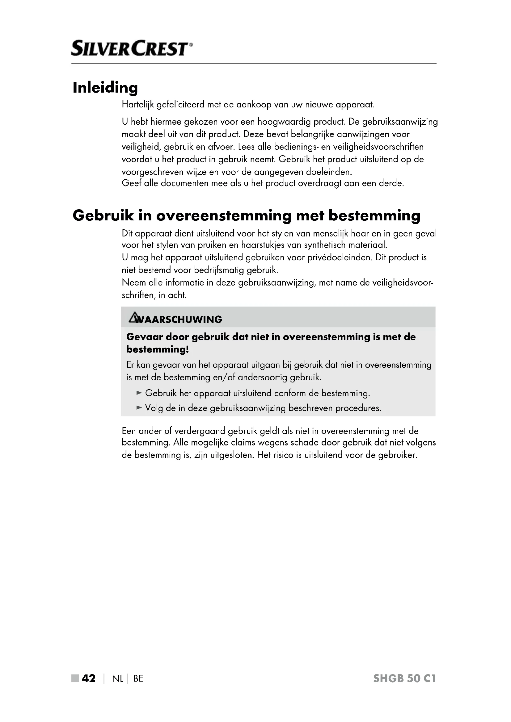 SHGB 50 C1 Inleiding Hartelijk gefeliciteerd met de aankoop van uw nieuwe apparaat. U hebt hiermee gekozen voor een hoogwaardig product. De gebruiksaanwijzing maakt deel uit van dit product. Deze bevat belangrijke aanwijzingen voor veiligheid, gebruik en afvoer. Lees alle bedienings- en veiligheidsvoorschriften voordat u het product in gebruik neemt. Gebruik het product uitsluitend op de voorgeschreven wijze en voor de aangegeven doeleinden. Geef alle documenten mee als u het product overdraagt aan een derde. Gebruik in overeenstemming met bestemming Dit apparaat dient uitsluitend voor het stylen van menselijk haar en in geen geval voor het stylen van pruiken en haarstukjes van synthetisch materiaal. U mag het apparaat uitsluitend gebruiken voor privédoeleinden. Dit product is niet bestemd voor bedrijfsmatig gebruik. Neem alle informatie in deze gebruiksaanwijzing, met name de veiligheidsvoor- schriften, in acht. WAARSCHUWING Gevaar door gebruik dat niet in overeenstemming is met de bestemming! Er kan gevaar van het apparaat uitgaan bij gebruik dat niet in overeenstemming is met de bestemming en/of andersoortig gebruik. ► Gebruik het apparaat uitsluitend conform de bestemming. ► Volg de in deze gebruiksaanwijzing beschreven procedures. Een ander of verdergaand gebruik geldt als niet in overeenstemming met de bestemming. Alle mogelijke claims wegens schade door gebruik dat niet volgens de bestemming is, zijn uitgesloten. Het risico is uitsluitend voor de gebruiker.NL