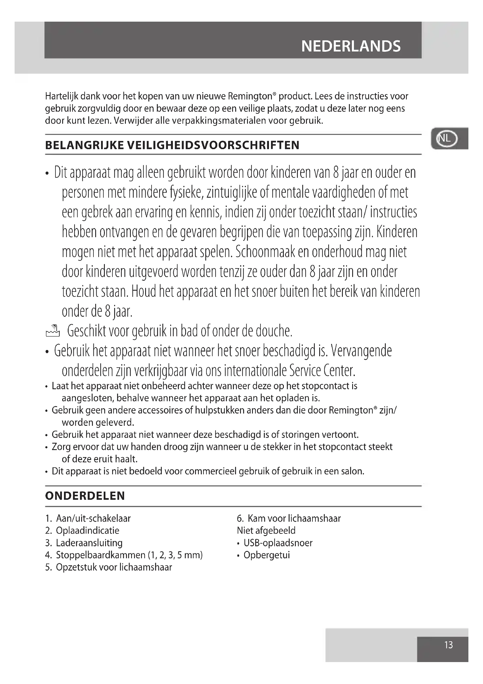 Hartelijk dank voor het kopen van uw nieuwe Remington® product. Lees de instructies voor gebruik zorgvuldig door en bewaar deze op een veiligeplaats, zodate later nog eens door=kunt lezen.Verwijder alle verpakkingsmaterialen voor gebruik.