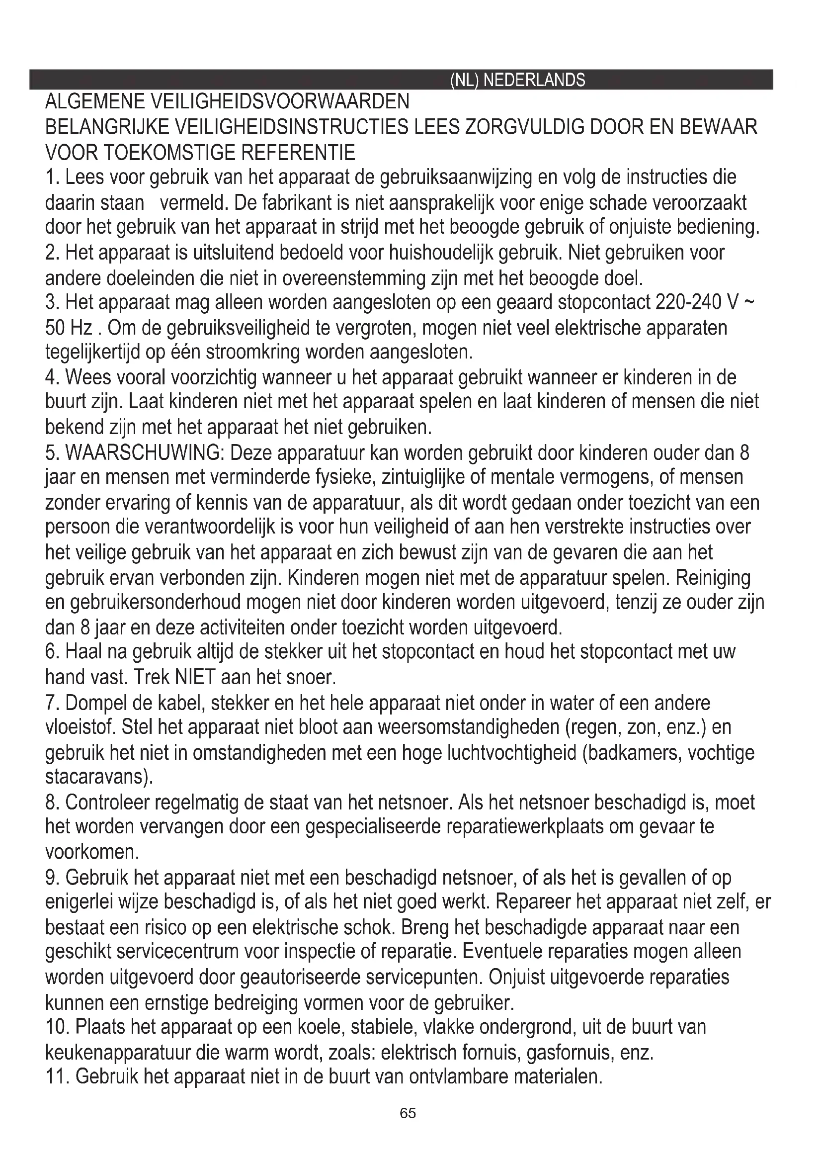 2. Het apparaat is uitsluitend bedoeld voor huishoudelijk gebruik. Niet gebruiken voor