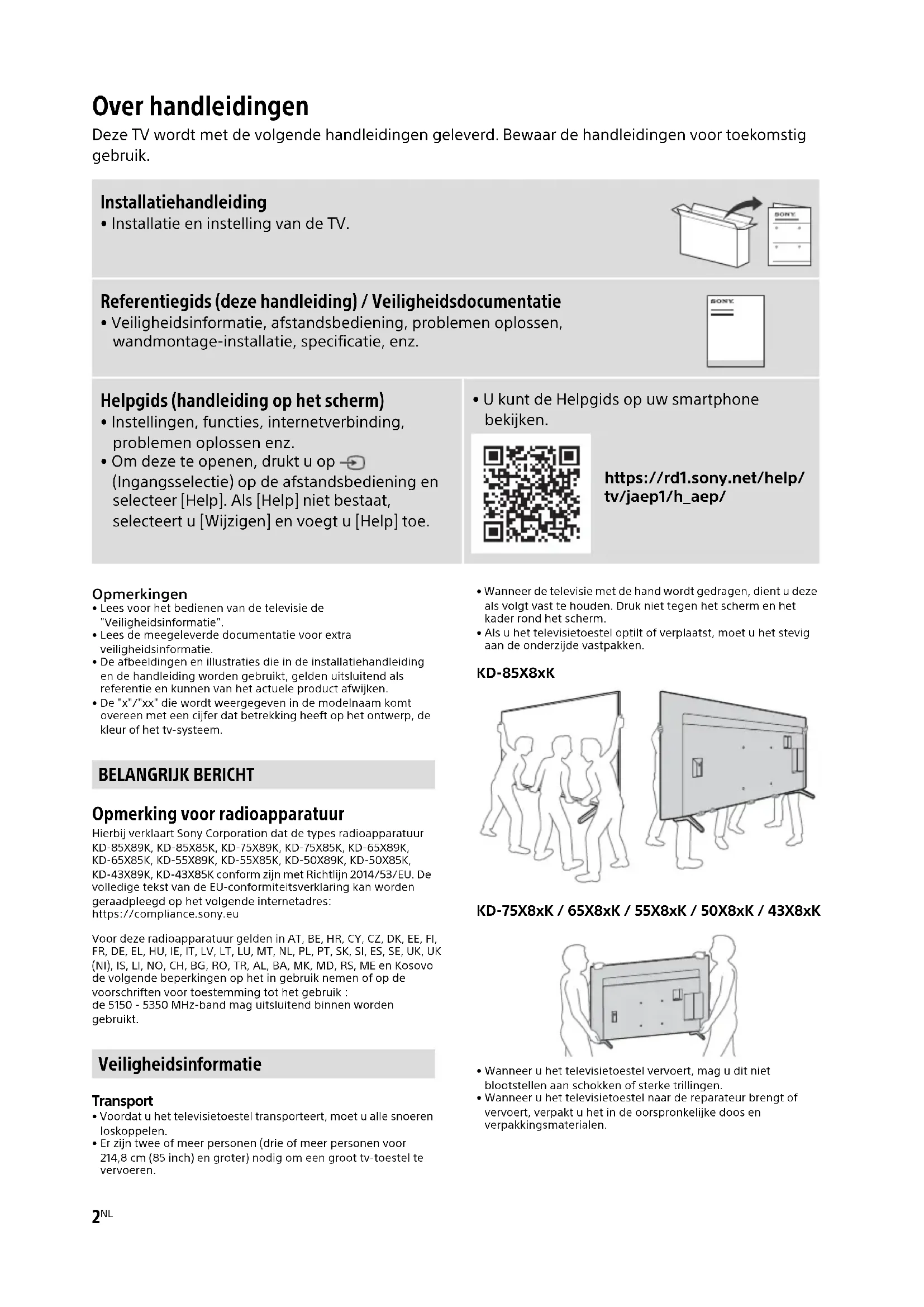 - De "x"/"xx" die wordt weergegeven in de modelnaam komt overeen met een cijfer dat betrekking heeft op het ontwerp, de kleur of het tv-systeem. Opmerking voor radioapparatuur Hierbij verklaart Sony Corporation dat de types radioapparatuur KD-85X89K, KD-85X85K, KD-75X89K, KD-75X85K, KD-65X89K, KD-65X85K, KD-55X89K, KD-55X85K, KD-50X89K, KD-50X85K, KD-43X89K, KD-43X85K conform zijn met Richtlijn 2014/53/EU. De volledige tekst van de EU-conformiteitsverklaring kan worden geraadpleegd op het volgende internetadres: https://compliance.sony.eu Voor deze radioapparatuur gelden in AT, BE, HR, CY, CZ, DK, EE, FI, FR, DE, EL, HU, IE, IT, LV, LT, LU, MT, NL, PL, PT, SK, SI, ES, SE, UK, UK (NI), IS, LI, NO, CH, BG, RO, TR, AL, BA, MK, MD, RS, ME en Kosovo de volgende beperkingen op het in gebruik nemen of op de voorschriften voor toestemming tot het gebruik : de 5150 - 5350 MHz-band mag uitsluitend binnen worden gebruikt. Transport