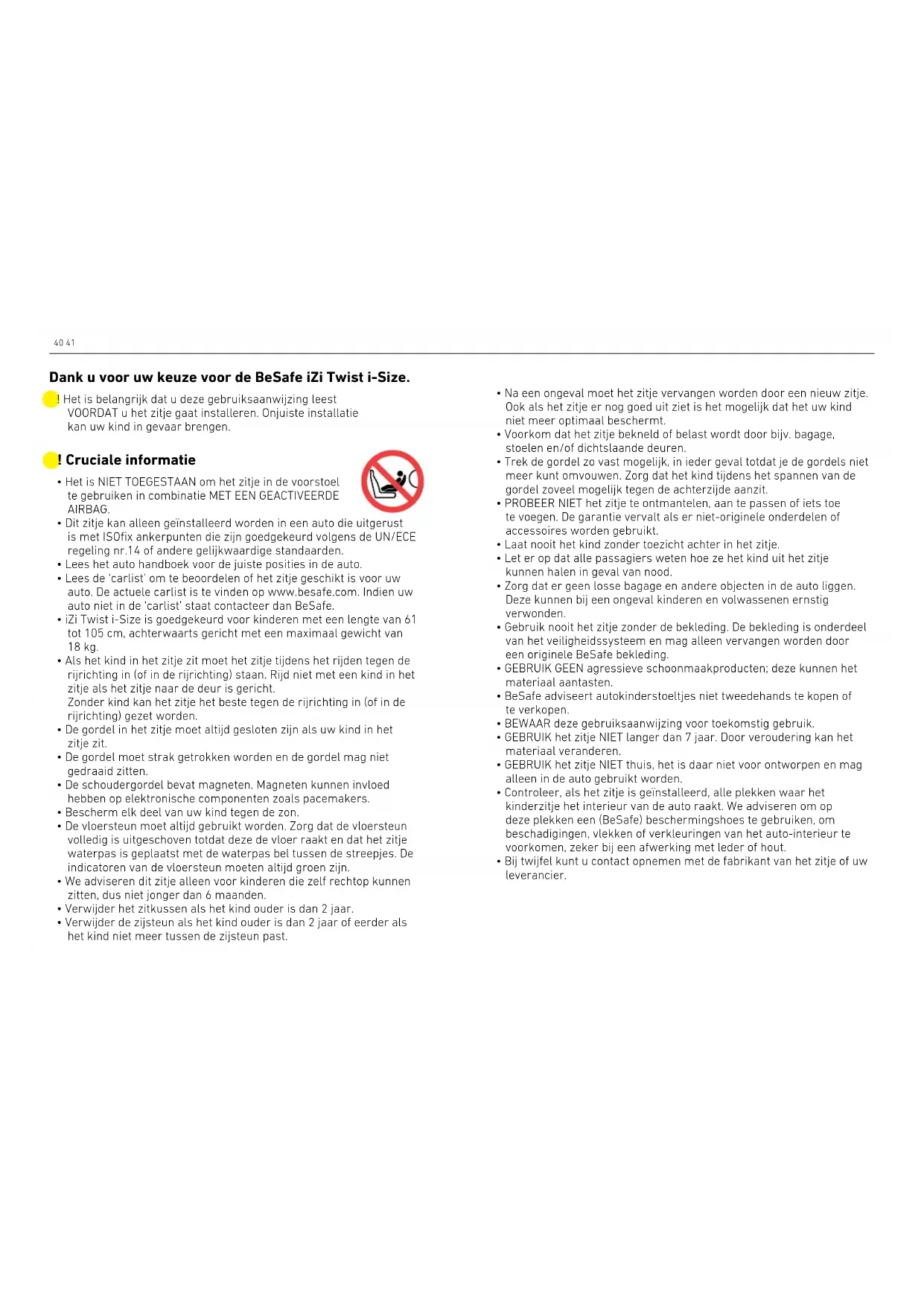 - Bij twijfel kunt u contact opnemen met de fabrikant van het zitje of uw leverancier. ! Het is belangrijk dat u deze gebruiksaanwijzing leest VOORDAT u het zitje gaat installeren. Onjuiste installatie kan uw kind in gevaar brengen. Dank u voor uw keuze voor de BeSafe iZi Twist i-Size.42 43