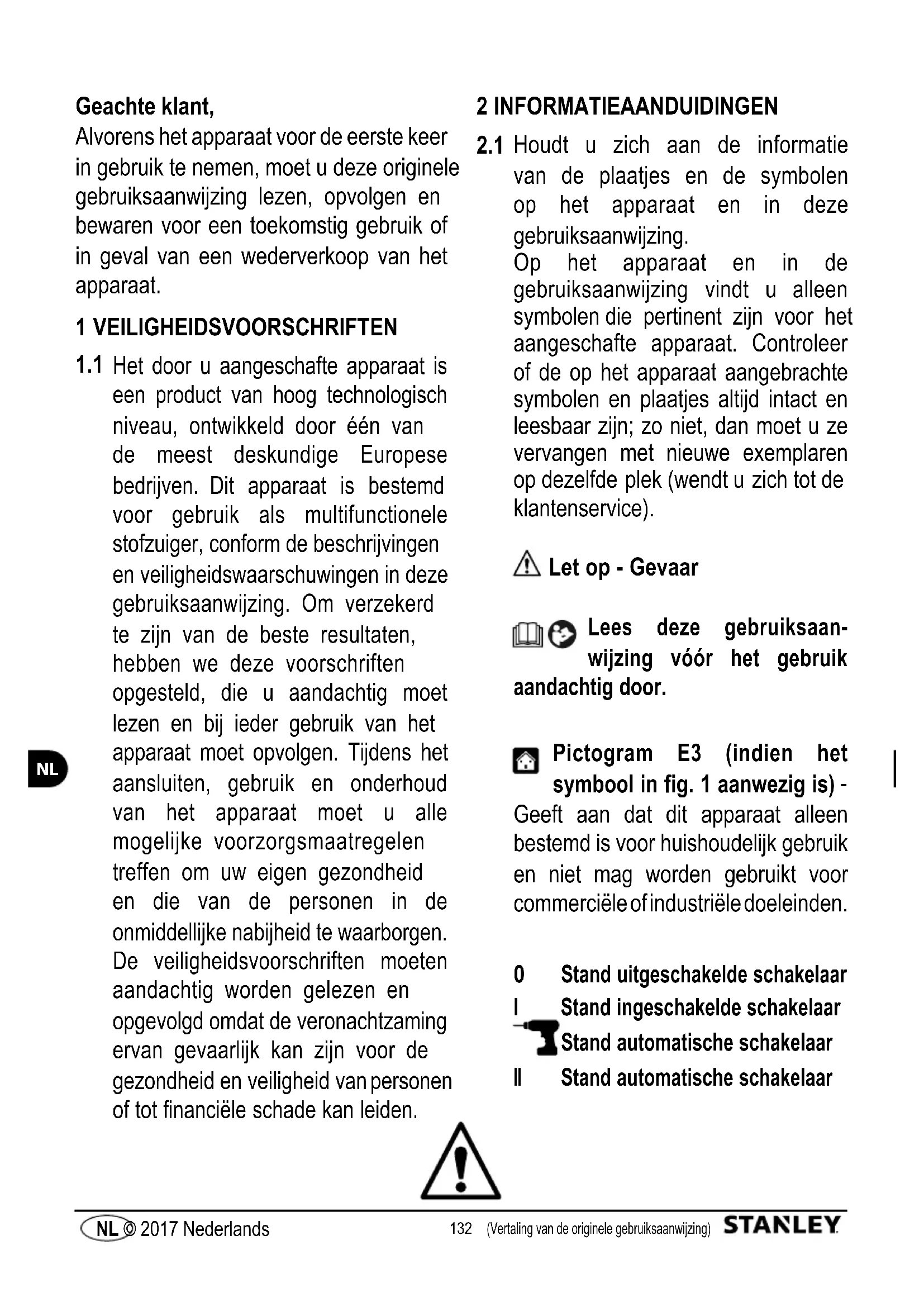 Stand automatische schakelaar132 133 (Vertaling van de originele gebruiksaanwijzing) NL © 2017 Nederlands (Vertaling van de originele gebruiksaanwijzing) NL © 2017 Nederlands