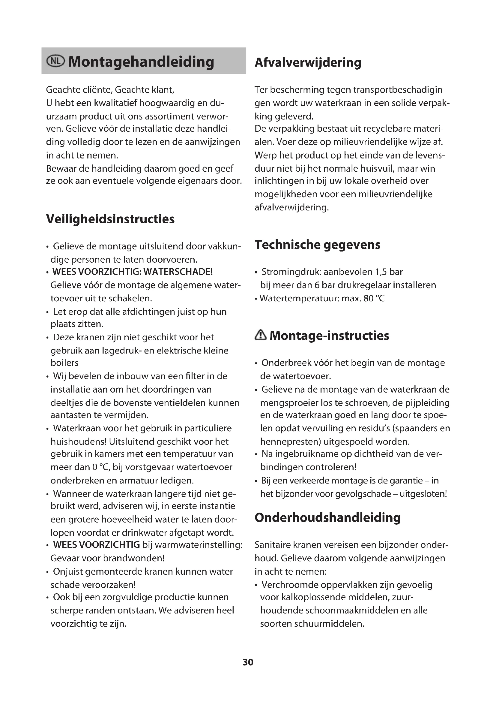 • Bij lekkages of zichtbare beschadigingen aan de kraan of de aansluitslangen moeten deze onmiddellijk door een vakman worden gecontroleerd of vervangen worden.