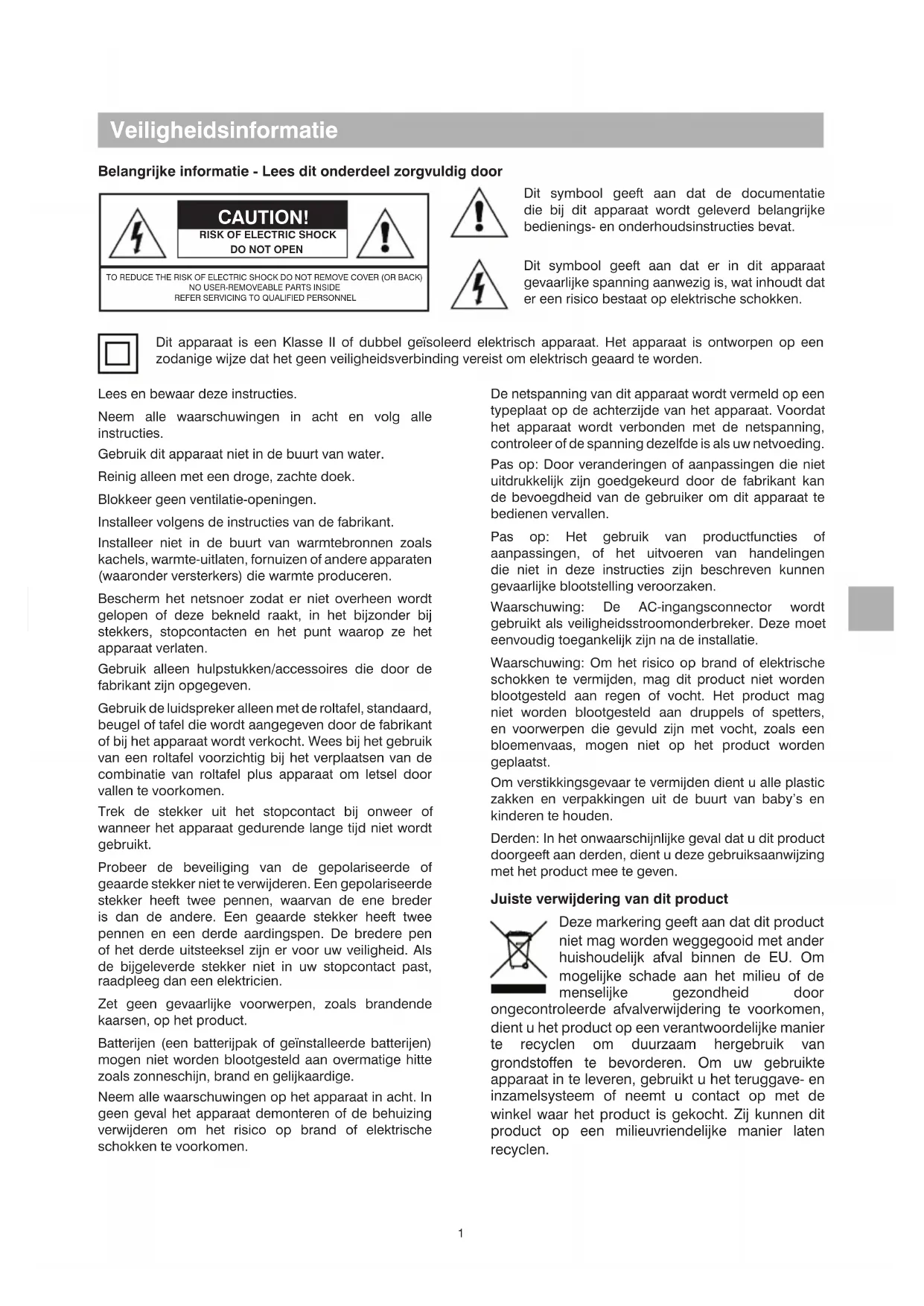 Veiligheidsinformatie Belangrijke informatie - Lees dit onderdeel zorgvuldig door CAUTION! RISK OF ELECTRIC SHOCKDO NOT OPENTO REDUCE THE RISK OF ELECTRIC SHOCK DO NOT REMOVE COVER (OR BACK)NO USER-REMOVEABLE PARTS INSIDEREFER SERVICING TO QUALIFIED PERSONNEL Dit symbool geeft aan dat de documentatie die bij dit apparaat wordt geleverd belangrijke bedienings- en onderhoudsinstructies bevat. Dit symbool geeft aan dat er in dit apparaat gevaarlijke spanning aanwezig is, wat inhoudt dat er een risico bestaat op elektrische schokken. Lees en bewaar deze instructies. Neem alle waarschuwingen in acht en volg alle instructies. Gebruik dit apparaat niet in de buurt van water. Reinig alleen met een droge, zachte doek. Blokkeer geen ventilatie-openingen. Installeer volgens de instructies van de fabrikant. Installeer niet in de buurt van warmtebronnen zoals kachels, warmte-uitlaten, fornuizen of andere apparaten (waaronder versterkers) die warmte produceren. Bescherm het netsnoer zodat er niet overheen wordt gelopen of deze bekneld raakt, in het bijzonder bij stekkers, stopcontacten en het punt waarop ze het apparaat verlaten. Gebruik alleen hulpstukken/accessoires die door de fabrikant zijn opgegeven. Gebruik de luidspreker alleen met de roltafel, standaard, beugel of tafel die wordt aangegeven door de fabrikant of bij het apparaat wordt verkocht. Wees bij het gebruik van een roltafel voorzichtig bij het verplaatsen van de combinatie van roltafel plus apparaat om letsel door vallen te voorkomen. Trek de stekker uit het stopcontact bij onweer of wanneer het apparaat gedurende lange tijd niet wordt gebruikt. Probeer de beveiliging van de gepolariseerde of geaarde stekker niet te verwijderen. Een gepolariseerde stekker heeft twee pennen, waarvan de ene breder is dan de andere. Een geaarde stekker heeft twee pennen en een derde aardingspen. De bredere pen of het derde uitsteeksel zijn er voor uw veiligheid. Als de bijgeleverde stekker niet in uw stopcontact past, raadpleeg dan een elektricien. Zet geen gevaarlijke voorwerpen, zoals brandende kaarsen, op het product. Batterijen (een batterijpak of geïnstalleerde batterijen) mogen niet worden blootgesteld aan overmatige hitte zoals zonneschijn, brand en gelijkaardige. Neem alle waarschuwingen op het apparaat in acht. In geen geval het apparaat demonteren of de behuizing verwijderen om het risico op brand of elektrische schokken te voorkomen. De netspanning van dit apparaat wordt vermeld op een typeplaat op de achterzijde van het apparaat. Voordat het apparaat wordt verbonden met de netspanning, controleer of de spanning dezelfde is als uw netvoeding. Pas op: Door veranderingen of aanpassingen die niet uitdrukkelijk zijn goedgekeurd door de fabrikant kan de bevoegdheid van de gebruiker om dit apparaat te bedienen vervallen. Pas op: Het gebruik van productfuncties of aanpassingen, of het uitvoeren van handelingen die niet in deze instructies zijn beschreven kunnen gevaarlijke blootstelling veroorzaken. Waarschuwing: De AC-ingangsconnector wordt gebruikt als veiligheidsstroomonderbreker. Deze moet eenvoudig toegankelijk zijn na de installatie. Waarschuwing: Om het risico op brand of elektrische schokken te vermijden, mag dit product niet worden blootgesteld aan regen of vocht. Het product mag niet worden blootgesteld aan druppels of spetters, en voorwerpen die gevuld zijn met vocht, zoals een bloemenvaas, mogen niet op het product worden geplaatst. Om verstikkingsgevaar te vermijden dient u alle plastic zakken en verpakkingen uit de buurt van baby’s en kinderen te houden. Derden: In het onwaarschijnlijke geval dat u dit product doorgeeft aan derden, dient u deze gebruiksaanwijzing met het product mee te geven. Juiste verwijdering van dit product Deze markering geeft aan dat dit product niet mag worden weggegooid met ander huishoudelijk afval binnen de EU. Om mogelijke schade aan het milieu of de menselijke gezondheid door ongecontroleerde afvalverwijdering te voorkomen, dient u het product op een verantwoordelijke manier te recyclen om duurzaam hergebruik van grondstoffen te bevorderen. Om uw gebruikte apparaat in te leveren, gebruikt u het teruggave- en inzamelsysteem of neemt u contact op met de winkel waar het product is gekocht. Zij kunnen dit product op een milieuvriendelijke manier laten recyclen. Dit apparaat is een Klasse II of dubbel geïsoleerd elektrisch apparaat. Het apparaat is ontworpen op een zodanige wijze dat het geen veiligheidsverbinding vereist om elektrisch geaard te worden.2