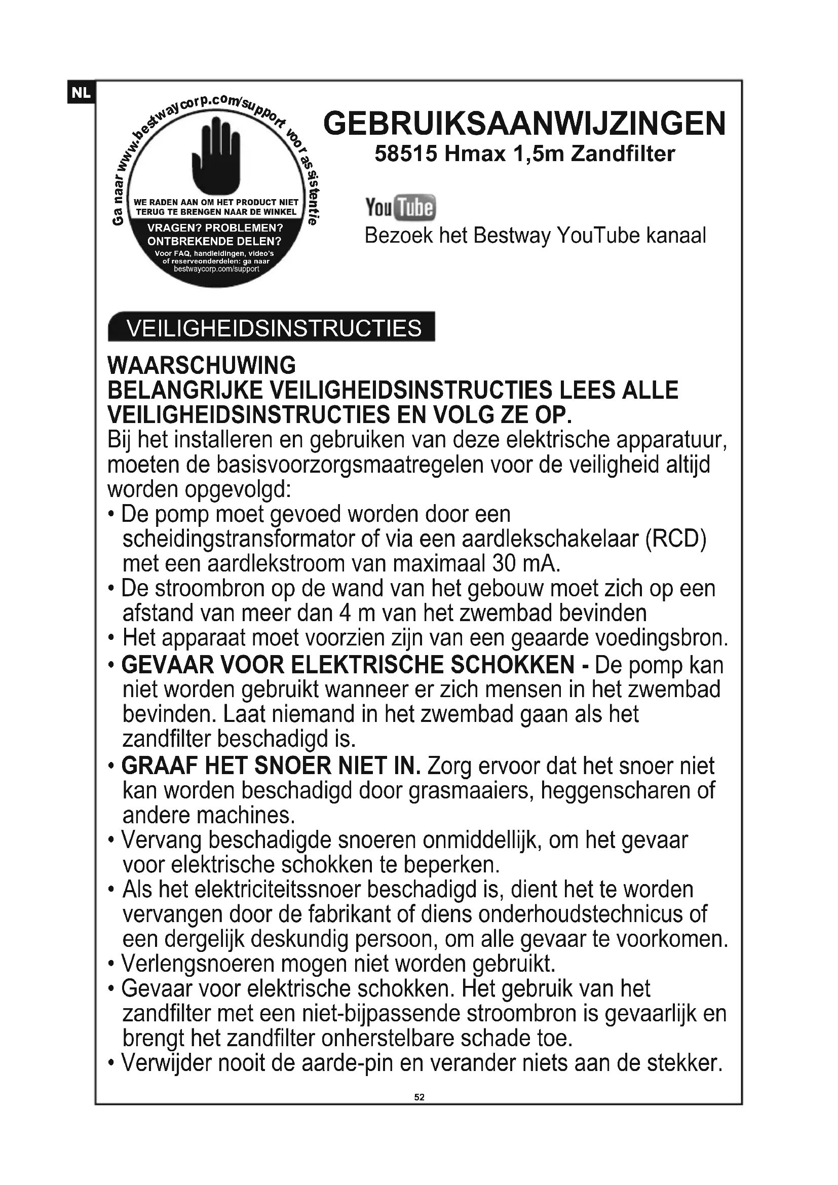 Bezoek het Bestway YouTube kanaal GEBRUIKSAANWIJZINGEN 58515 Hmax 1,5m Zandfilter WAARSCHUWING