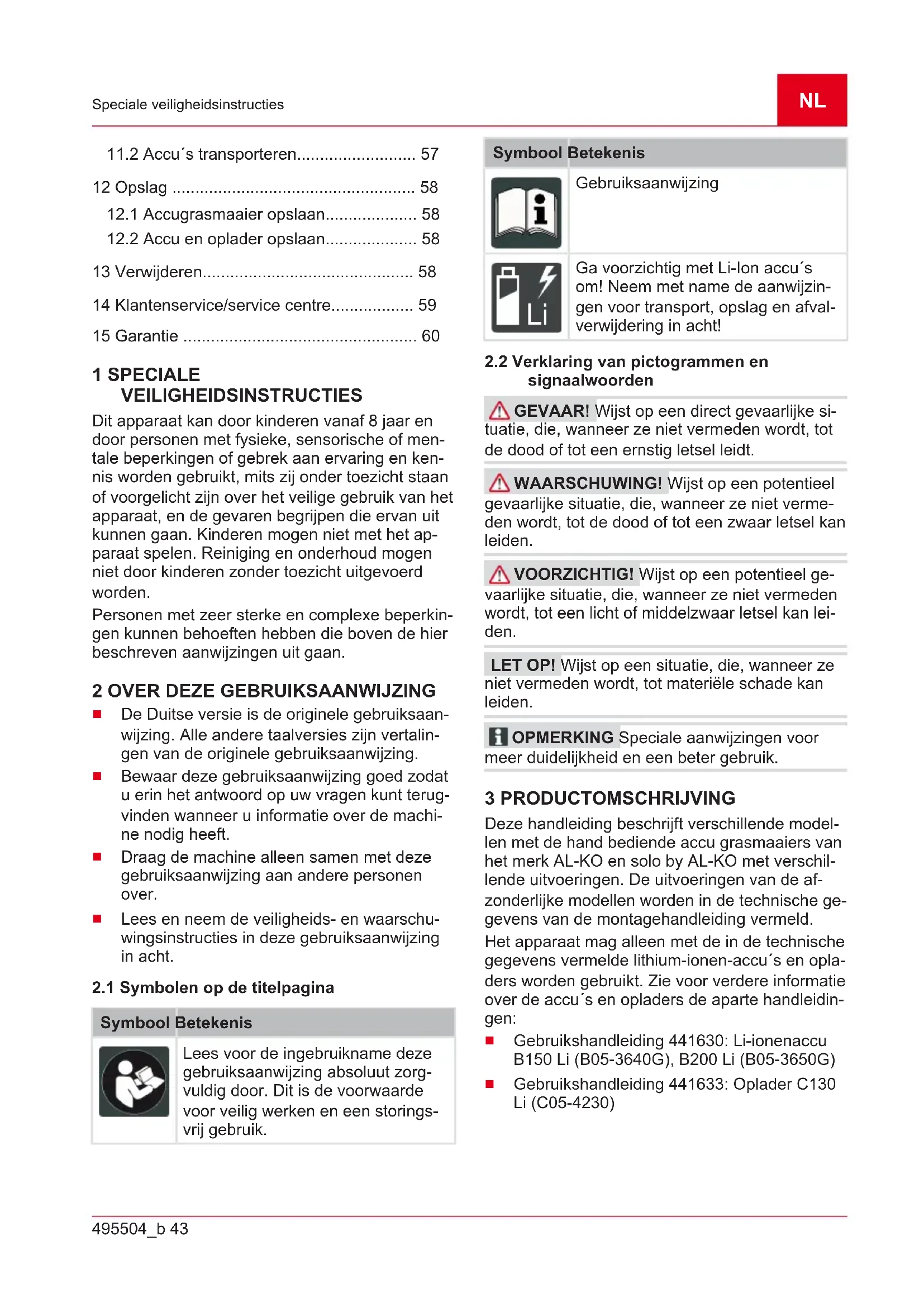Een verzamelpunt van de fabrikant (indien hij geen lid is van het gemeenschappelijke recy- cling systeem) Deze voorschriften zijn alleen voor toepassing op accu’s en batterijen die in landen van de Europe- se Unie verkocht werden en die beantwoorden aan de Europese richtlijn 2006/66/EU. In landen buiten de Europese Unie kunnen afwijkende be- palingen voor de recycling van accu’s en batterij- en gelden. 14 KLANTENSERVICE/SERVICE CENTRE Voor vragen over garantie, reparatie of reserve- onderdelen kunt u contact opnemen met het dichtstbijzijnde AL-KOservice centre. Deze vindt u op internet op het volgende adres: www.al-ko.com/service-contactsNL 60 495504_b Garantie 15 GARANTIE Eventueel binnen de wettelijke termijn voor aansprakelijkheid optredende materiaal- of fabricagefou- ten van het apparaat worden naar eigen oordeel door ons verholpen, hetzij door reparatie of door le- vering van een vervangend apparaat. De geldende termijn voor aansprakelijkheid hangt in elk geval af van de wetgeving in het land waarin het apparaat werd aangeschaft. Onze garantie geldt alleen bij: