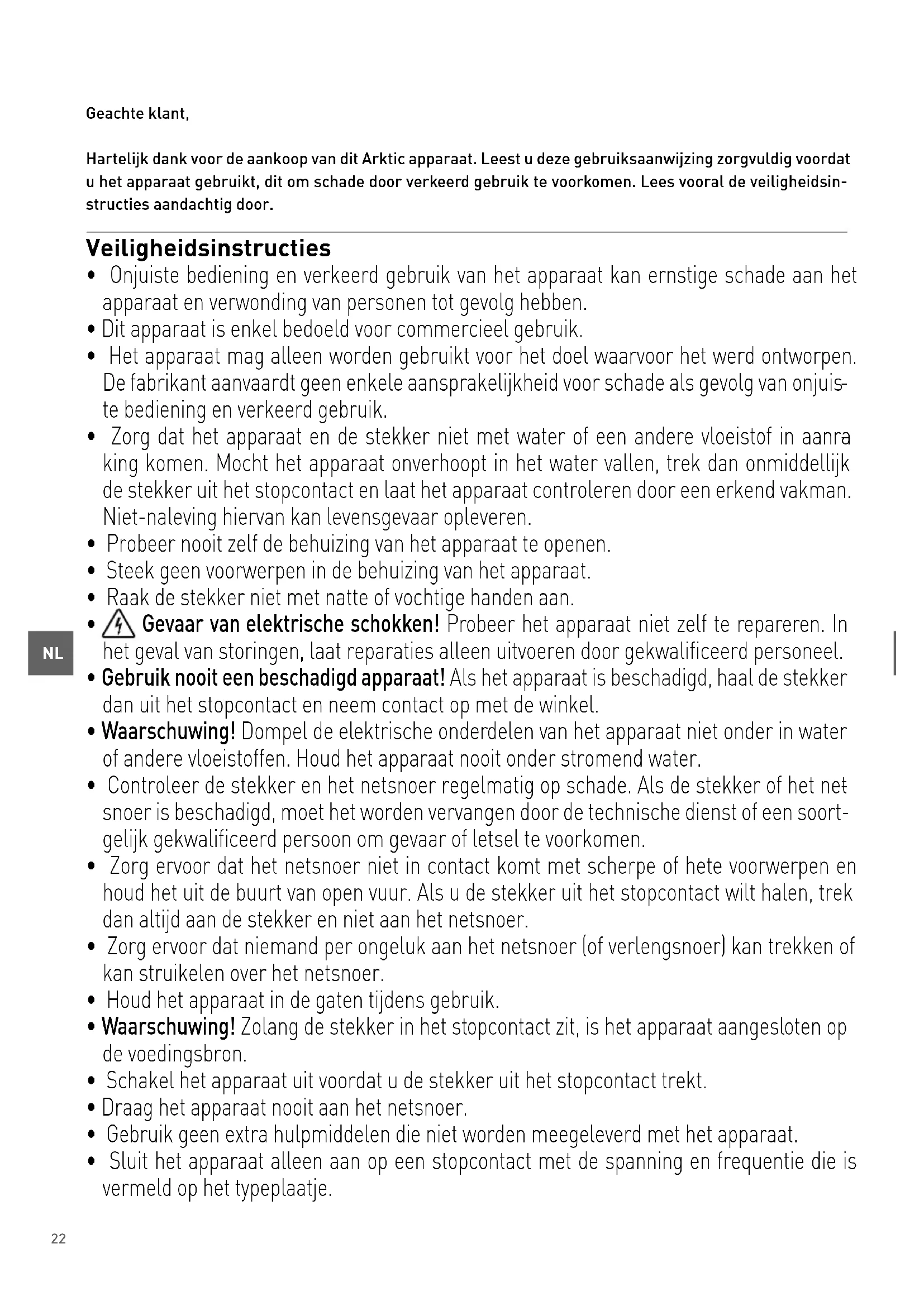 Geachte klant, Hartelijk dank voor de aankoop van dit Arktic apparaat. Leest u deze gebruiksaanwijzing zorgvuldig voordat u het apparaat gebruikt, dit om schade door verkeerd gebruik te voorkomen. Lees vooral de veiligheidsin- structies aandachtig door. Veiligheidsinstructies