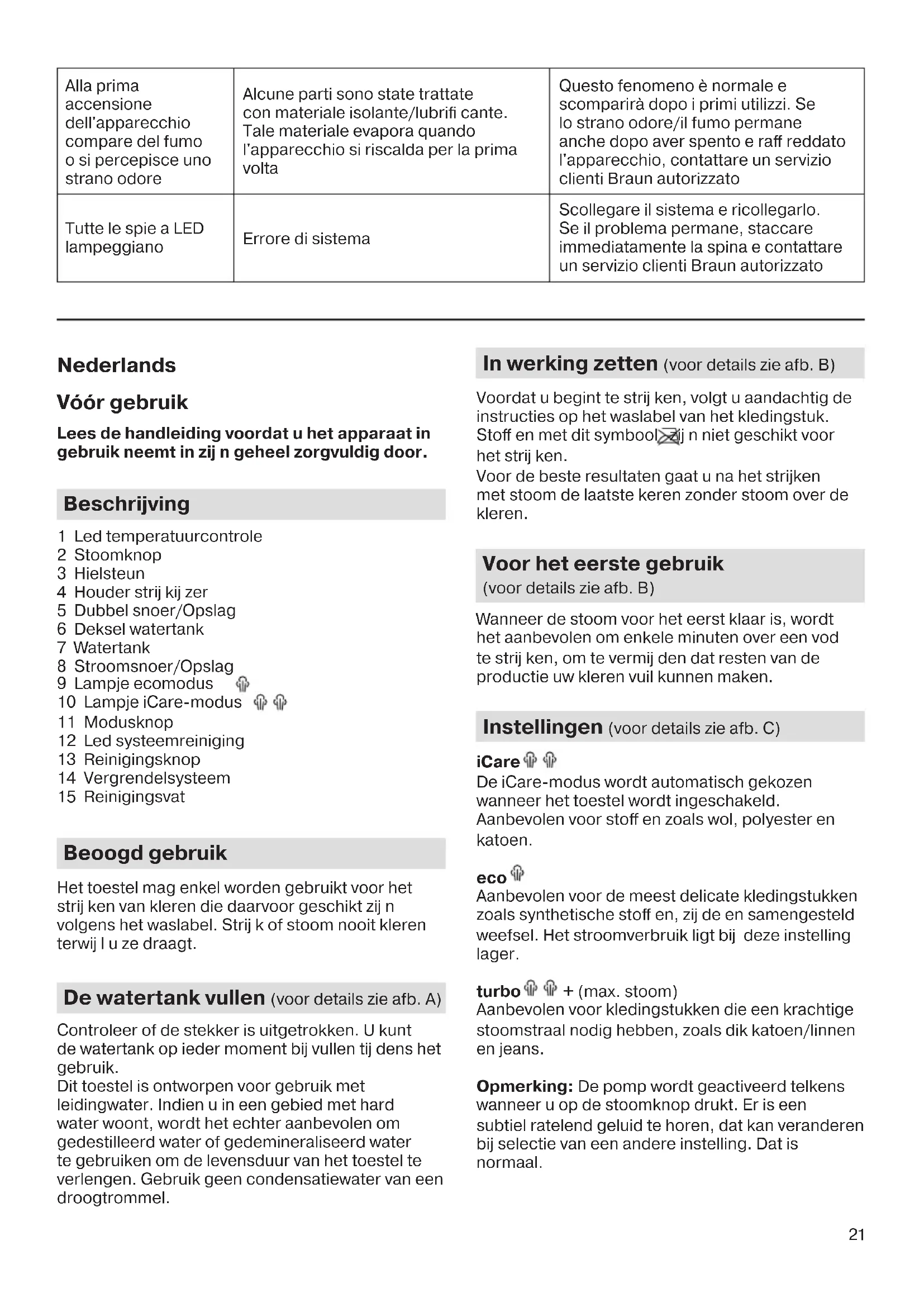 Il ferro da stiro non produce vapore All’inizio della sessione di stiratura il tasto per il vapore non è stato premuto abbastanza a lungo Tenere premuto il tasto per il vapore fi nché non fuoriesce il vapore. Potrebbero essere necessari 30 secondi fi nché non fuoriesce il vapore Non c'è suffi ciente acqua nel serbatoio dell'acqua Riempire il serbatoio dell'acqua Se il LED del sistema di pulizia si accende, la funzione di vapore è stata disabilitata fi nché non viene eff ettuata la procedura di pulizia Eseguire la procedura di pulizia (vedere capitolo dedicato) Il ferro da stiro si sta riscaldando Se il LED di controllo temperatura lampeggia, il ferro da stiro si sta riscaldando; durante questa fase la funzione di vapore è disabilitata. Attendere fi no a quando il LED di controllo temperatura non si accende in maniera permanente. Durante l’emissione di vapore il sistema produce un rumore di pompaggio associato a vibrazioni Se il serbatoio dell’acqua è pieno, si tratta di una normale condizione operativa Non è richiesta alcuna azione Il serbatoio dell'acqua è vuoto Spegnere l’apparecchio, staccare la spina e riempire il serbatoio dell’acqua. Premere il tasto per il vapore fi nché non fuoriesce il vapore. Goccioline di acqua fuoriescono dalla piastra Il vapore si condensa in acqua nel tubo quando si utilizza il vapore per la prima volta o non viene utilizzato per tanto tempo È un fenomeno normale. Tenere il ferro da stiro lontano dall’indumento e premere il tasto per il vapore. Attendere fi nché dalla piastra fuoriesce il vapore al posto dell’acqua Durante la stiratura particelle e impurità bianche fuoriescono dalla piastra L’acqua del rubinetto è molto dura Se l’acqua del rubinetto è dura raccomandiamo di utilizzare acqua distillata o demineralizzata Le impurità delle sostanze chimiche presenti nell’acqua si sono depositate nei canali del vapore e/o nella piastra Eseguire regolarmente la procedura di pulizia anche se non richiesto dal sistema L'acqua fuoriesce dalla piastra La procedura è stata attivata accidentalmente. Spegnere l’apparecchio e staccare la spina. Collocare il ferro da stiro sul recipiente di pulitura, accenderlo ed eseguire la procedura di pulitura completa (vedere capitolo dedicato) 5712812391_IS_21xx_INT.indd 20 26.06.20 12:1321 Alla prima accensione dell'apparecchio compare del fumo o si percepisce uno strano odore Alcune parti sono state trattate con materiale isolante/lubrifi cante. Tale materiale evapora quando l'apparecchio si riscalda per la prima volta Questo fenomeno è normale e scomparirà dopo i primi utilizzi. Se lo strano odore/il fumo permane anche dopo aver spento e raff reddato l'apparecchio, contattare un servizio clienti Braun autorizzato Tutte le spie a LED lampeggiano Errore di sistema Scollegare il sistema e ricollegarlo. Se il problema permane, staccare immediatamente la spina e contattare un servizio clienti Braun autorizzato Nederlands Vóór gebruik Lees de handleiding voordat u het apparaat in gebruik neemt in zij n geheel zorgvuldig door. Beschrijving 1 Led temperatuurcontrole 2 Stoomknop 3 Hielsteun 4 Houder strij kij zer 5 Dubbel snoer/Opslag 6 Deksel watertank 7 Watertank 8 Stroomsnoer/Opslag 9 Lampje ecomodus 10 Lampje iCare-modus 11 Modusknop 12 Led systeemreiniging 13 Reinigingsknop 14 Vergrendelsysteem 15 Reinigingsvat Beoogd gebruik Het toestel mag enkel worden gebruikt voor het strij ken van kleren die daarvoor geschikt zij n volgens het waslabel. Strij k of stoom nooit kleren terwij l u ze draagt. De watertank vullen (voor details zie afb. A) Controleer of de stekker is uitgetrokken. U kunt de watertank op ieder moment bij vullen tij dens het gebruik. Dit toestel is ontworpen voor gebruik met leidingwater. Indien u in een gebied met hard water woont, wordt het echter aanbevolen om gedestilleerd water of gedemineraliseerd water te gebruiken om de levensduur van het toestel te verlengen. Gebruik geen condensatiewater van een droogtrommel. In werking zetten (voor details zie afb. B) Voordat u begint te strij ken, volgt u aandachtig de instructies op het waslabel van het kledingstuk. Stoff en met dit symbool zij n niet geschikt voor het strij ken. Voor de beste resultaten gaat u na het strijken met stoom de laatste keren zonder stoom over de kleren. Voor het eerste gebruik (voor details zie afb. B) Wanneer de stoom voor het eerst klaar is, wordt het aanbevolen om enkele minuten over een vod te strij ken, om te vermij den dat resten van de productie uw kleren vuil kunnen maken. Instellingen (voor details zie afb. C) iCare De iCare-modus wordt automatisch gekozen wanneer het toestel wordt ingeschakeld. Aanbevolen voor stoff en zoals wol, polyester en katoen. eco Aanbevolen voor de meest delicate kledingstukken zoals synthetische stoff en, zij de en samengesteld weefsel. Het stroomverbruik ligt bij deze instelling lager. turbo + (max. stoom) Aanbevolen voor kledingstukken die een krachtige stoomstraal nodig hebben, zoals dik katoen/linnen en jeans. Opmerking: De pomp wordt geactiveerd telkens wanneer u op de stoomknop drukt. Er is een subtiel ratelend geluid te horen, dat kan veranderen bij selectie van een andere instelling. Dat is normaal. 5712812391_IS_21xx_INT.indd 21 26.06.20 12:1322 Automatische uitschakeling van het strij kij zer (voor details zie afb. D) Indien deze functie geactiveerd is, begint de led van temperatuurcontrole te knipperen. Ontkalken (voor details zie afb. E) Het systeem zal u eraan herinneren dat u regelmatig moet ontkalken, ongeacht het type water dat u gebruikt. Het ontkalken kan op ieder moment plaatsvinden, zelfs wanneer het systeem dit niet aangeeft. Indien de led voor reiniging (12) en het geluids- signaal geactiveerd zijn, kunt u verder blijven strijken. U hoeft het ontkalken niet meteen uit te voeren. De reiniging kan worden uitgevoerd na afloop van het strijken of de volgende keer dat het toestel wordt ingeschakeld. Indien het toestel wordt uitgeschakeld zonder dat de