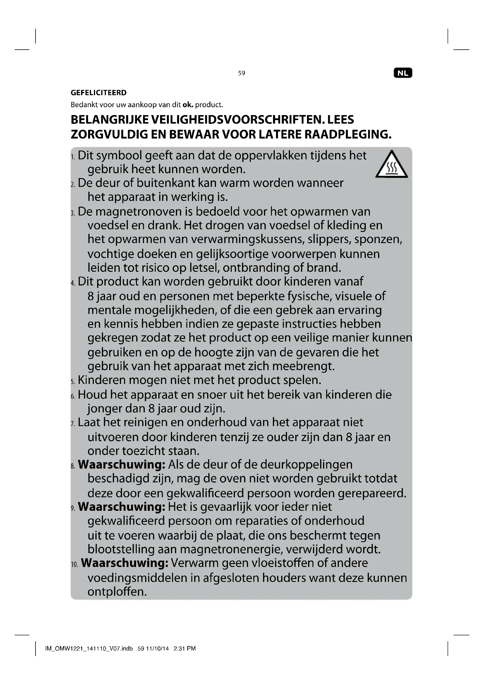 voedingsmiddelen in afgesloten houders want deze kunnen ontploen. IM_OMW1221_141110_V07.indb 59 11/10/14 2:31 PM60