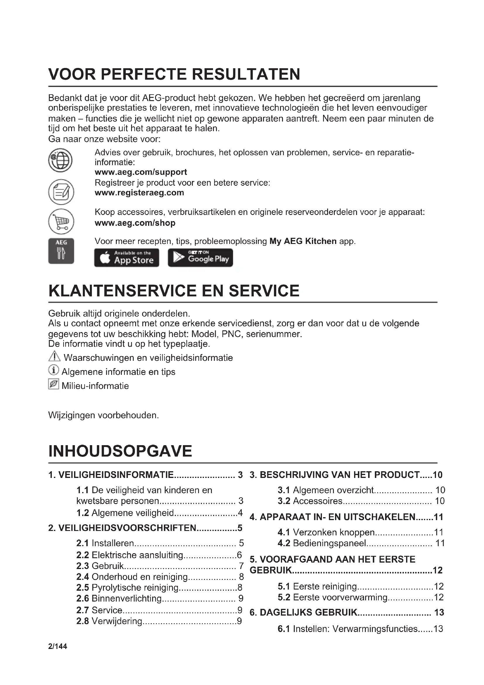 Bedankt dat je voor dit AEG-product hebt gekozen. We hebben het gecreëerd om jarenlang onberispelijke prestaties te leveren, met innovatieve technologieën die het leven eenvoudiger maken – functies die je wellicht niet op gewone apparaten aantreft. Neem een paar minuten de tijd om het beste uit het apparaat te halen. Ga naar onze website voor: Advies over gebruik, brochures, het oplossen van problemen, service- en reparatie- informatie: www.aeg.com/support Registreer je product voor een betere service: www.registeraeg.com Koop accessoires, verbruiksartikelen en originele reserveonderdelen voor je apparaat: www.aeg.com/shop Voor meer recepten, tips, probleemoplossing My AEG Kitchen app.