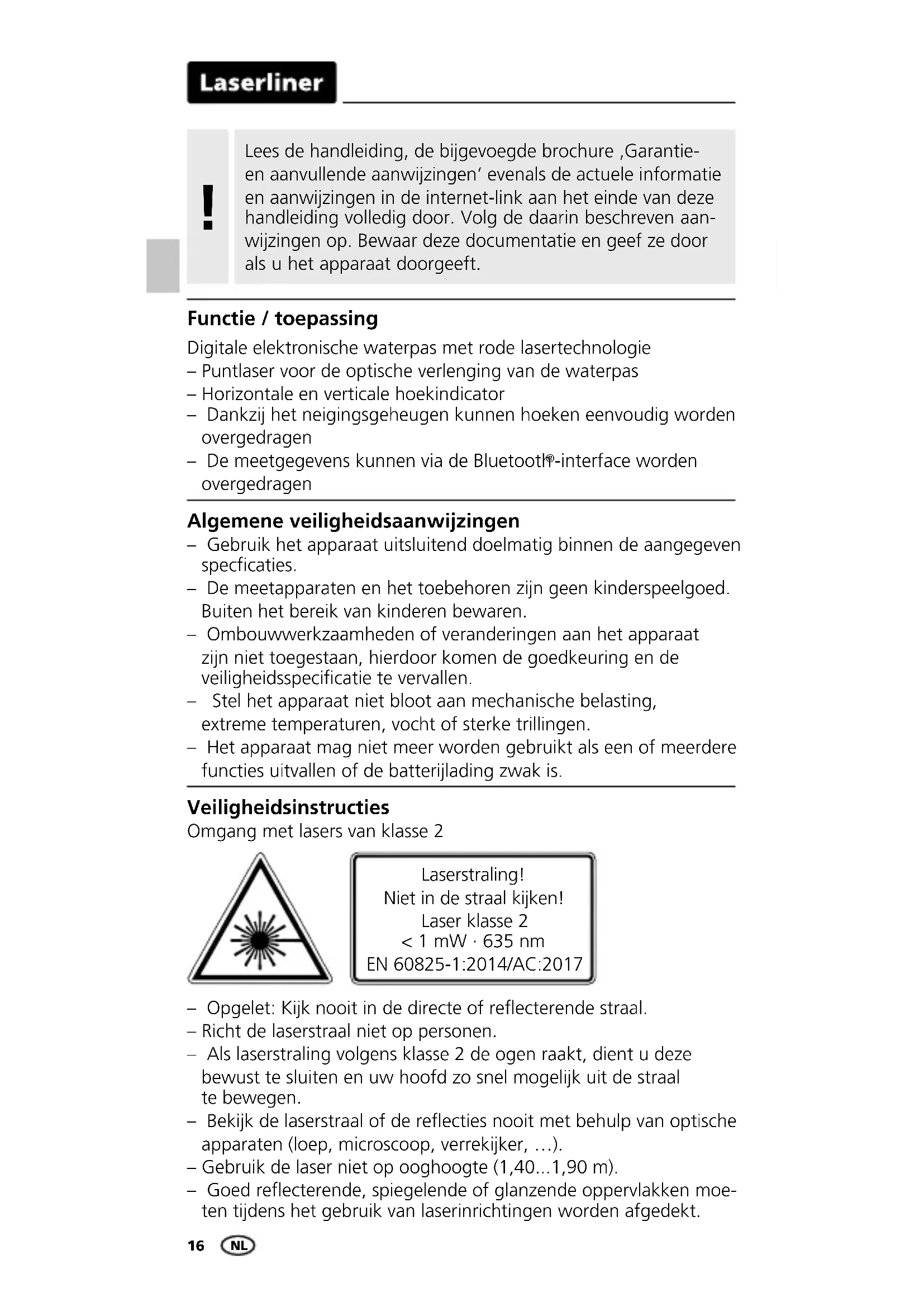 Calibration The measuring device must be calibrated and tested on a regular basis to ensure it is accurate and working properly. We recommend carrying out calibration once a year. Contact your distributor or the UMAREX-LASERLINER service department. Technical data Electronic measuring precision ± 0.05° at 0° … 1° ± 0.1° at 1° … 89° ± 0,05° at 89° … 90° Vial accuracy ± 0.5 mm/m Display accuracy 2 decimal places Laser wavelength 635 nm Laser class 2 / < 1 mW (EN 60825-1:2014/AC:2017) Power supply 2 x 1.5V LR03 (AAA) Operating time with laser: approx. 10 hours without laser: approx. 55 hours Radio module operating data Bluetooth LE 4.x interface; Frequency band: ISM band 2400–2483.5 MHz, 40 channels; Transmission power: max. 10mW; Bandwidth: 2 MHz; Bit rate: 1 Mbit/s; Modulation: GFSK/FHSS Operating conditions -10°C … 50°C, max. humidity 80% rH, no condensation, max. working altitude 2000 m above sea level Storage conditions -20°C … 70°C, max. humidity 80% rH Dimensions 40 400 x 63 x 33 mm (W x H x D) Dimensions 60 600 x 63 x 33 mm (W x H x D) Dimensions 80 800 x 63 x 33 mm (W x H x D) Dimensions 100 1000 x 63 x 33 mm (W x H x D) Dimensions 120 1200 x 63 x 33 mm (W x H x D) Weight 40/60/80/100/120 548 g / 722 g / 968 g / 1105 g / 1360 g (incl. batteries) Subject to technical change without notice. 20W36 EU directives and disposal This device complies with all necessary standards for the free movement of goods within the EU. This product is an electric device and must be collected separately for disposal according to the European Directive on waste electrical and electronic equipment. Further safety and supplementary notices at: http://laserliner.com/info?an=AHJ EN16 Veiligheidsinstructies Omgang met lasers van klasse 2 Algemene veiligheidsaanwijzingen – Gebruik het apparaat uitsluitend doelmatig binnen de aangegeven speccaties. – De meetapparaten en het toebehoren zijn geen kinderspeelgoed. Buiten het bereik van kinderen bewaren. – Ombouwwerkzaamheden of veranderingen aan het apparaat zijn niet toegestaan, hierdoor komen de goedkeuring en de veiligheidsspecicatie te vervallen. – Stel het apparaat niet bloot aan mechanische belasting, extreme temperaturen, vocht of sterke trillingen. – Het apparaat mag niet meer worden gebruikt als een of meerdere functies uitvallen of de batterijlading zwak is. – Opgelet: Kijk nooit in de directe of reecterende straal. – Richt de laserstraal niet op personen. – Als laserstraling volgens klasse 2 de ogen raakt, dient u deze bewust te sluiten en uw hoofd zo snel mogelijk uit de straal te bewegen. – Bekijk de laserstraal of de reecties nooit met behulp van optische apparaten (loep, microscoop, verrekijker, …). – Gebruik de laser niet op ooghoogte (1,40...1,90 m). – Goed reecterende, spiegelende of glanzende oppervlakken moe- ten tijdens het gebruik van laserinrichtingen worden afgedekt. Laserstraling! Niet in de straal kijken! Laser klasse 2 < 1 mW · 635 nm EN 60825-1:2014/AC:2017 Digitale elektronische waterpas met rode lasertechnologie – Puntlaser voor de optische verlenging van de waterpas – Horizontale en verticale hoekindicator – Dankzij het neigingsgeheugen kunnen hoeken eenvoudig worden overgedragen – De meetgegevens kunnen via de Bluetooth