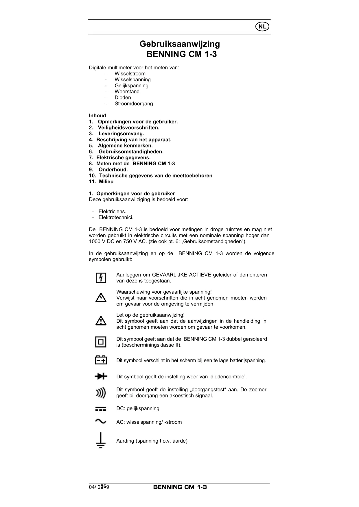 De BENNING CM 1-3 is bedoeld voor metingen in droge ruimtes en mag Niet worden gebruikt in elektrische circuits met een nominale spanning hoger dan 1000VDC en 750VAC . (zie ook pt. 6: "Gebruiksomstandigheden").