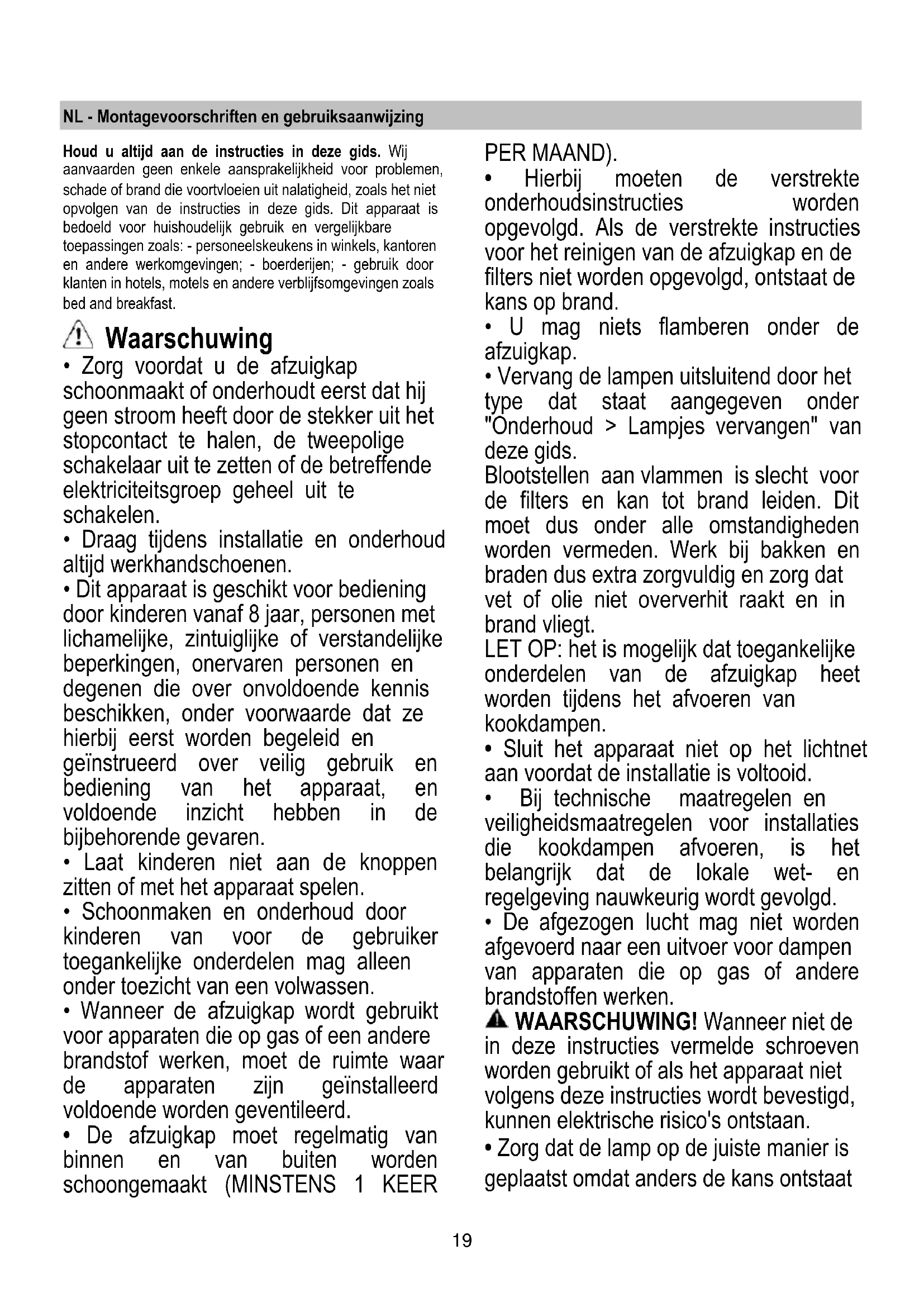 - Hierbij moeten de verstrekte onderhoudsinstructies worden opgevolgd. Als de verstrekte instructies voor het reinigen van de afzuigkap en de filters niet worden opgevolgd, ontstaat de kans op brand.