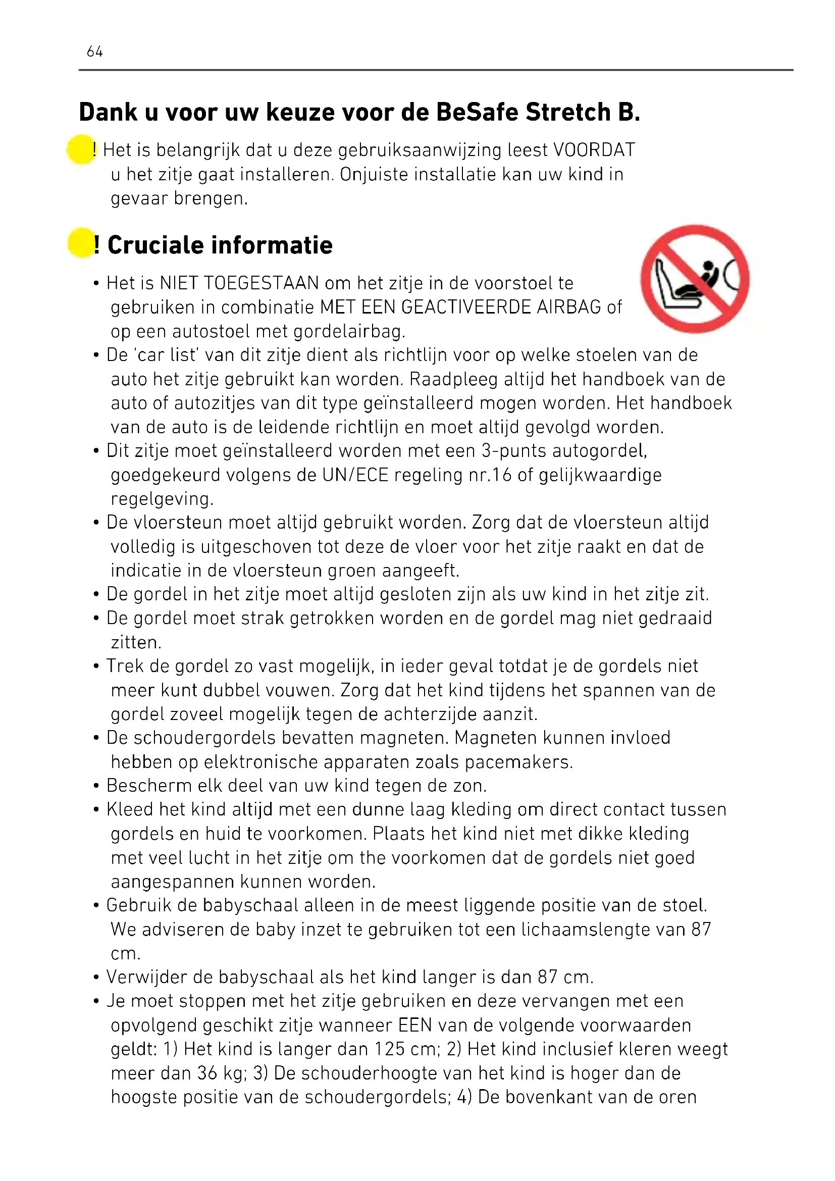 - Je moet stoppen met het zitje gebruiken en deze vervangen met een opvolgend geschikt zitje wanneer EEN van de volgende voorwaarden geldt: 1) Het kind is langer dan 125 cm; 2) Het kind inclusief kleren weegt meer dan 36 kg; 3) De schouderhoogte van het kind is hoger dan de hoogste positie van de schoudergordels; 4) De bovenkant van de oren ! Het is belangrijk dat u deze gebruiksaanwijzing leest VOORDAT u het zitje gaat installeren. Onjuiste installatie kan uw kind in gevaar brengen. Dank u voor uw keuze voor de BeSafe Stretch B.65 komen boven het hoogste punt van de hoofdsteun uit, wanneer deze in de hoogste positie staat.