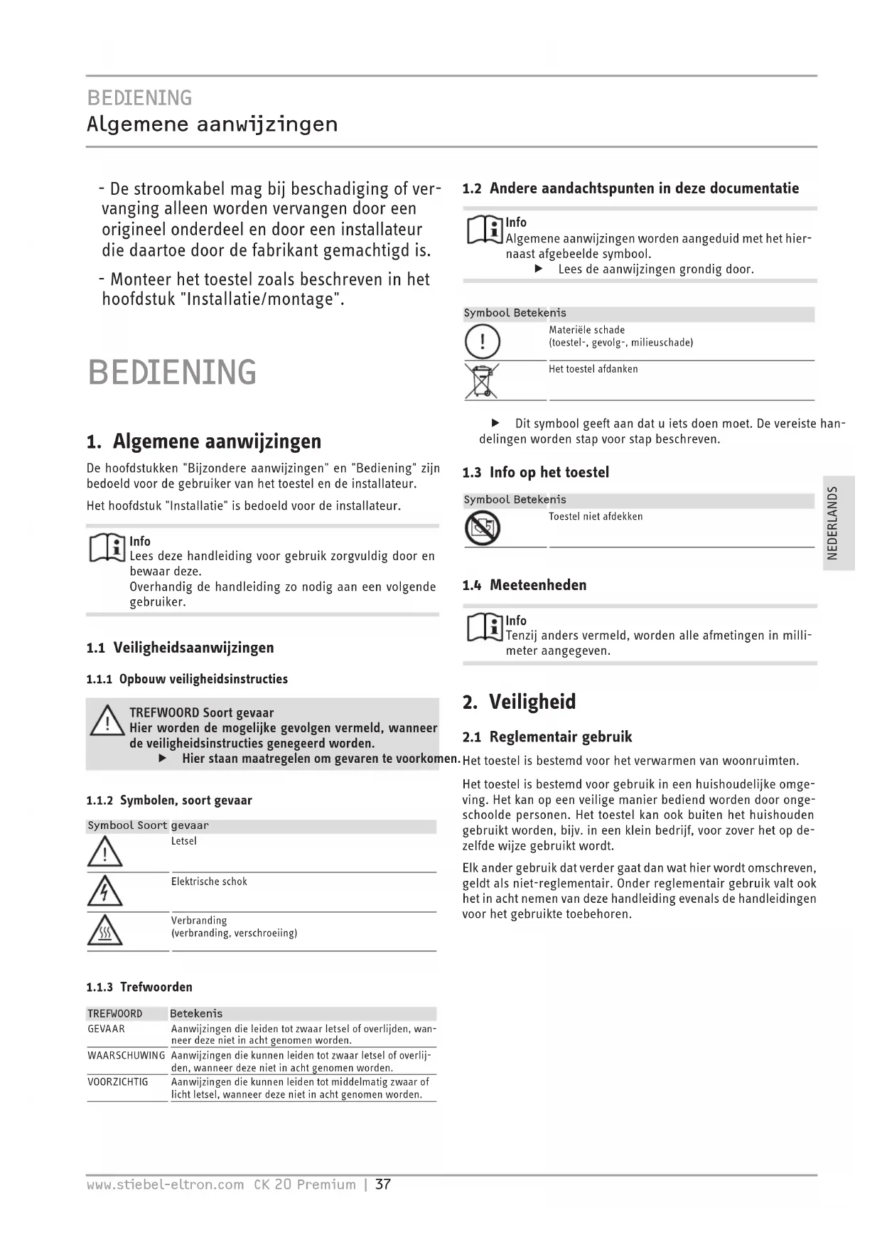 teur restent inchangées. Environnement et recyclage Merci de contribuer à la préservation de notre environnement. Après usage, procédez à l’élimination des matériaux conformé- ment à la réglementation nationale. GARANTIE PROTECTION DE L’ENVIRONNEMENT ET RECYCLAGE36 | CK 20 Premium www.stiebel-eltron.com INHOUD | BzONDeRe INfO BzONDeRe INfO - Houd kinderen jonger dan 3 jaar uit de buurt van het toestel, wanneer er niet voortdurend toezicht is. - Het toestel kan door kinderen van 3 tot 7 jaar worden in- en uitgeschakeld, wanneer er toezicht op hen gehouden wordt, of wanneer ze met betrekking tot het veilige gebruik van het toestel geïnstrueerd zijn en de gevaren die daaruit ontstaan, begrepen hebben. Voor- waarde hiervoor is dat het toestel gemonteerd is, zoals beschreven. Kinderen van 3 tot 7 jaar mogen de stekker niet in het stopcontact ste- ken en mogen het toestel niet regelen. - Het toestel kan door kinderen vanaf 8jaar, alsmede door personen met fysieke, zintuig- lijke of geestelijke beperkingen of met een ge- brek aan ervaring en kennis gebruikt worden, wanneer er toezicht op hen gehouden wordt, of wanneer ze met betrekking tot het veilige gebruik van het toestel getraind zijn en de ge- varen die daaruit ontstaan, begrepen hebben. - Kinderen mogen niet met het toestel spelen. Kinderen mogen zonder toezicht het toestel niet reinigen noch gebruikersonderhoudsta- ken uitvoeren. - Delen van het toestel kunnen zeer heet wor- den en verbrandingen veroorzaken. Wanneer er kinderen en hulpbehoevenden aanwezig zijn, is extra voorzichtigheid geboden. - Dek het toestel niet af om oververhitting van het toestel te vermijden. - Plaats het toestel niet direct onder een stopcontact. - Bij een vaste aansluiting moet het toestel met een afstand van ten minste 3mm op alle polen van de netaansluiting kunnen worden losgekoppeld. BIJZONDERE INFO BEDIENING