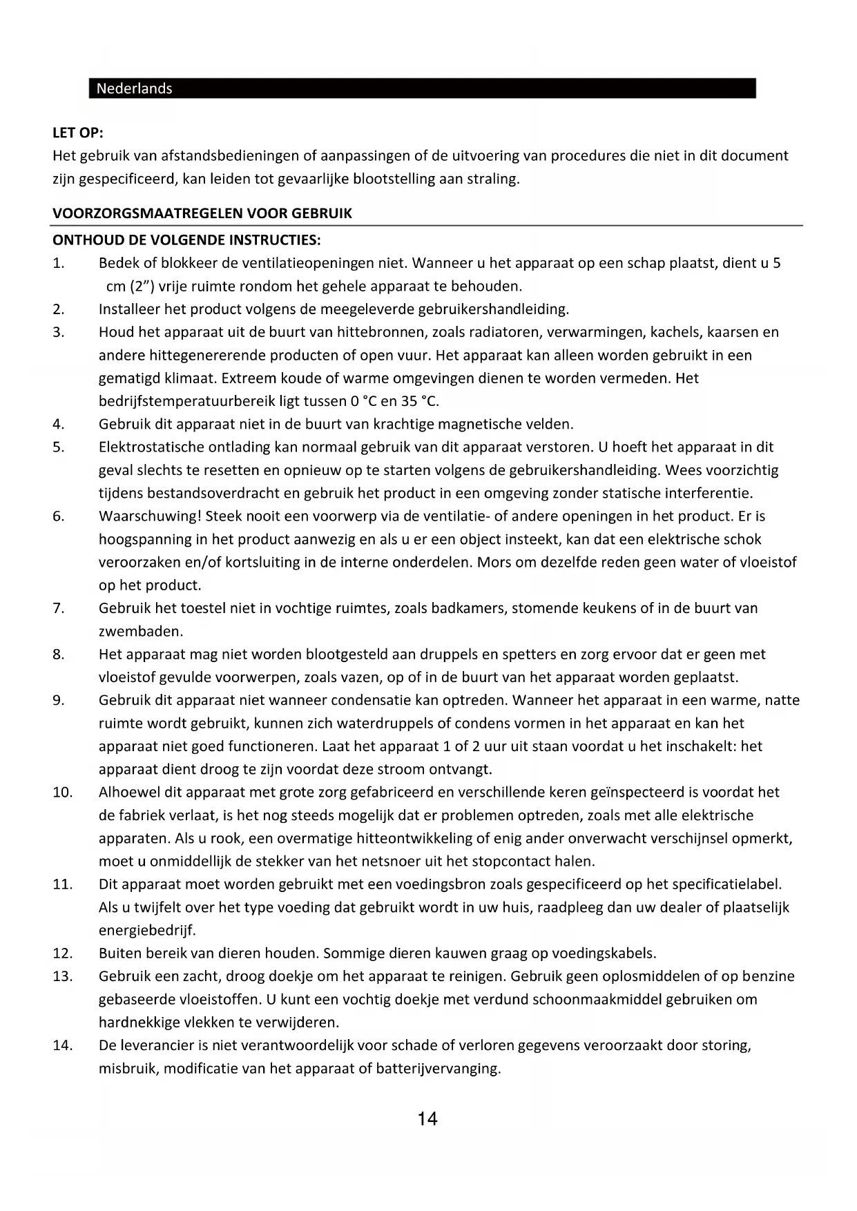 - Houd het apparaat uit de buurt van hittebronnen, zoals radiatoren, verwarmingen, kachels, kaarsen en andere hittegenererende producten of open vuur. Het apparaat kan alleen worden gebruikt in een gematigd klimaat. Extreem koude of warme omgevingen dienen to worden vermeden. Het bedrijfstemporatuurbereik ligtussen 0^ en 35^ .