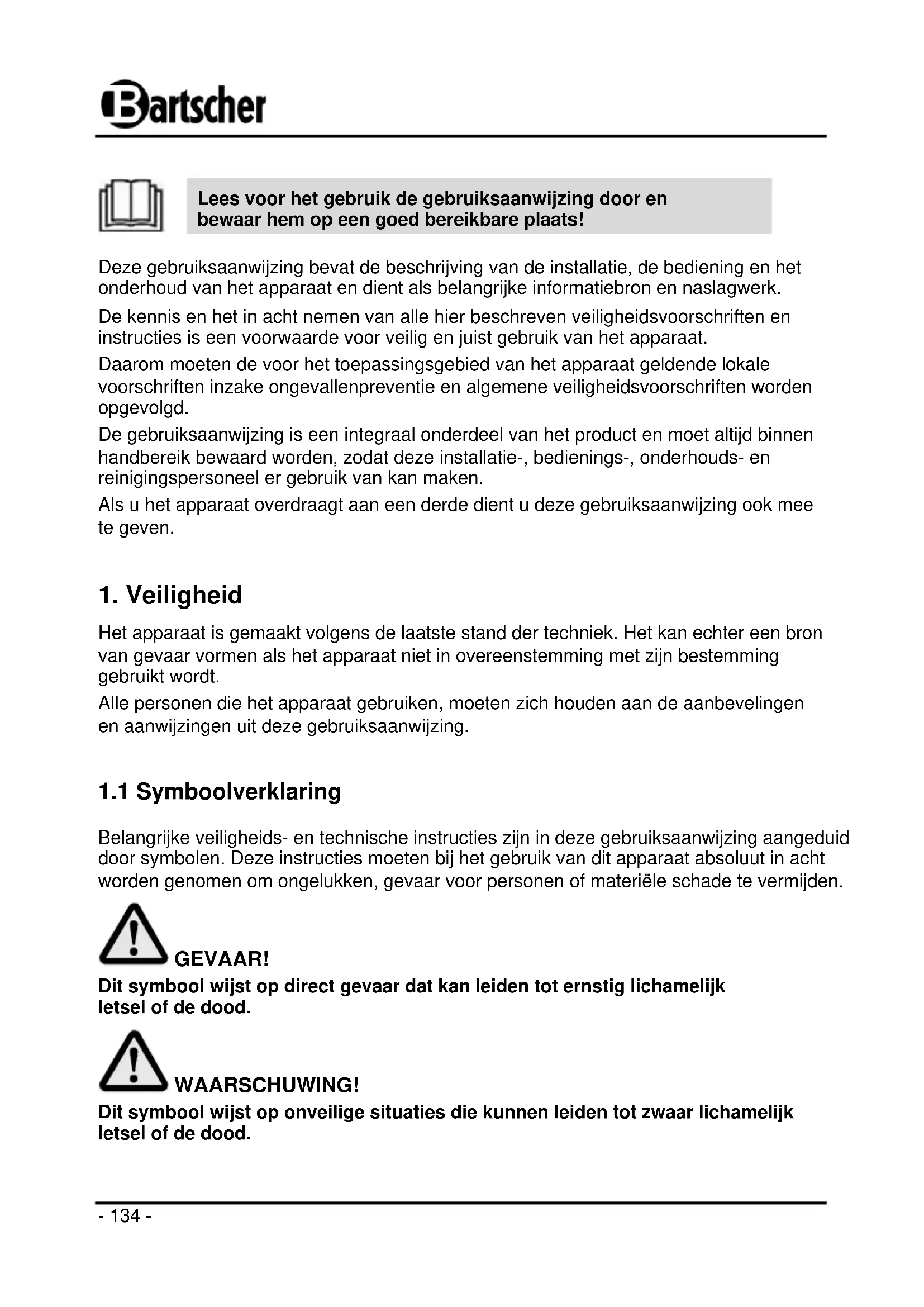 Belangrijke veiligheids- en technische instructies zijn in deze gebruiksaanwijzing aangeduid door symbolen. Deze instructies moeten bij het gebruik van dit apparaat absoluut in acht worden genomen om ongelukken, gevaar voor personen of materiële schade te vermijden. GEVAAR! Dit symbool wijst op direct gevaar dat kan leiden tot ernstig lichamelijk letsel of de dood. WAARSCHUWING! Dit symbool wijst op onveilige situaties die kunnen leiden tot zwaar lichamelijk letsel of de dood.- 135 -