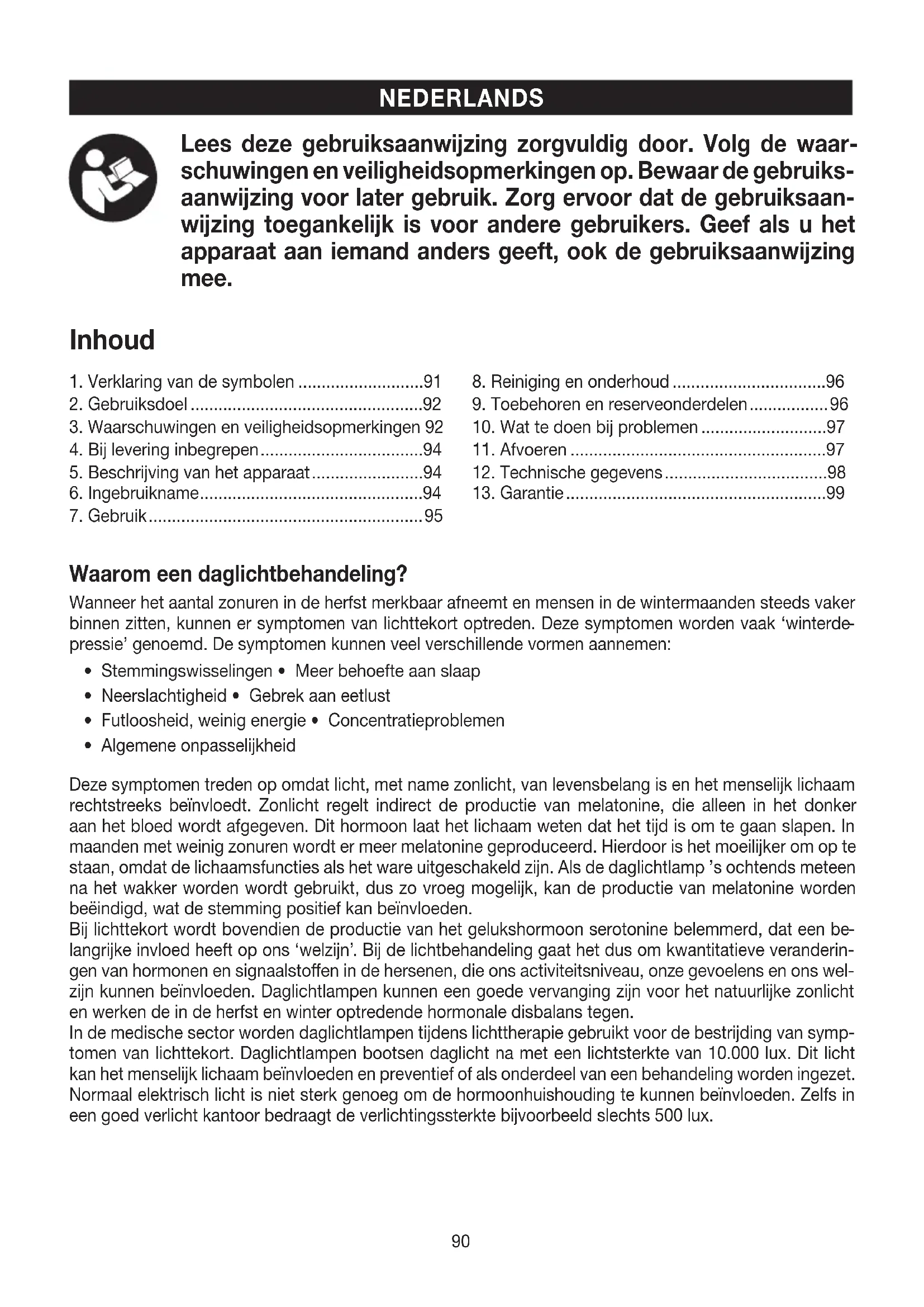 sić producentowi i/lub pełnomocnikowi producenta oraz odpowiedniemu krajowemu urzędowi państwa członkowskiego, wktórym znajduje się użytkownik/pacjent. Zastrzega się prawo do pomyłek izmian90 NEDERLANDS Lees deze gebruiksaanwijzing zorgvuldig door. Volg de waar- schuwingen en veiligheidsopmerkingen op. Bewaar de gebruiks- aanwijzing voor later gebruik. Zorg ervoor dat de gebruiksaan- wijzing toegankelijk is voor andere gebruikers. Geef als u het apparaat aan iemand anders geeft, ook de gebruiksaanwijzing mee. Waarom een daglichtbehandeling? Wanneer het aantal zonuren in de herfst merkbaar afneemt en mensen in de wintermaanden steeds vaker binnen zitten, kunnen er symptomen van lichttekort optreden. Deze symptomen worden vaak ‘winterde