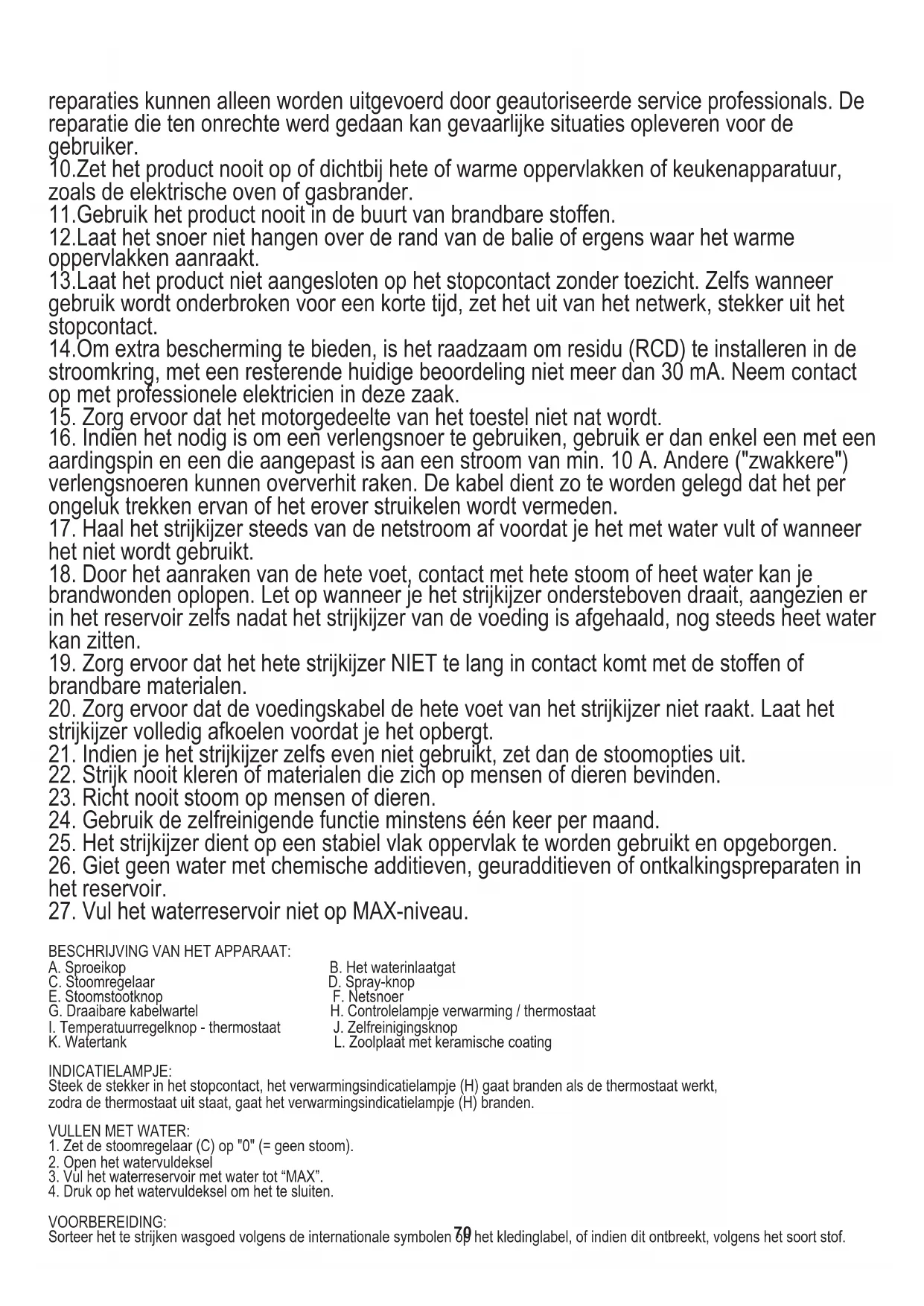 brandwonden oplopen. Let op wanneer je het strijkijzer ondersteboven draait, aangezien er in het reservoir zelfs nadat het strijkijzer van de voeding is afgehaald, nog steeds heet water kan zitten. BESCHRIJVING VAN HET APPARAAT: