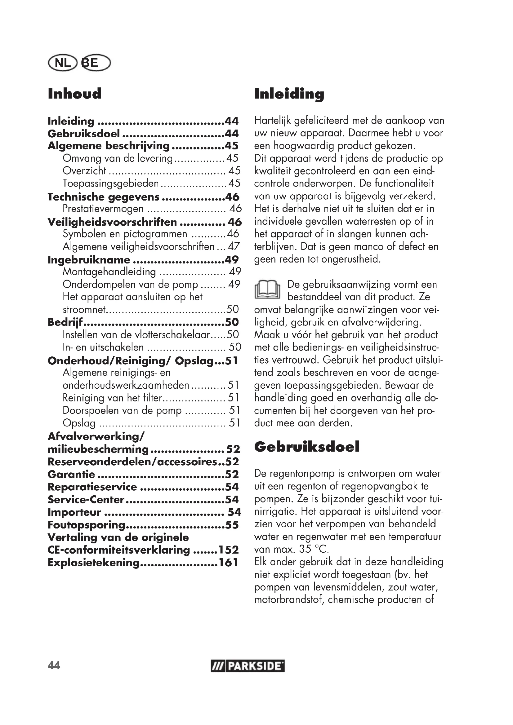 10 Verbindingsstuk 11 Adapter 13-15 5x dichtingsring 17 buigzame buis 19 2x Aluminium buis Garantie Geachte cliënte, geachte klant, U krgt op dit apparaat 3 jaar garantie, te rekenen vanaf de datum van aankoop. Ingeval van gebreken aan dit product heeft u tegenover de verkoper van het product wettelke rechten. Deze wettelke rechten worden door onze hierna beschreven ga- rantie niet beperkt. Garantievoorwaarden De garantietermn begint met de datum van aankoop. Gelieve de originele kassa- bon goed te bewaren. Dit document wordt als bews van de aankoop benodigd. Indien er zich binnen drie jaar, te rekenen vanaf de datum van aankoop van dit pro- duct, een materiaal- of fabricagefout voor- doet, wordt het product door ons – naar onze keuze – voor u gratis gerepareerd of53 BENL vervangen. Deze garantievergoeding stelt voorop dat binnen de termn van drie jaar het defecte apparaat en het bews van aankoop (kassabon) voorgelegd en dat schriftelk kort beschreven wordt, waarin het gebrek bestaat en wanneer het zich voorgedaan heeft. Als het defect door onze garantie gedekt is, krgt u het gerepareerde of een nieuw product terug. Met herstelling of uitwis- seling van het product begint er geen nieuwe garantieperiode. Garantieperiodeenwettelke kwaliteitsgarantie De garantieperiode wordt door de ga- rantievergoeding niet verlengd. Dit geldt ook voor vervangen en gerepareerde onderdelen. Eventueel al b de aankoop bestaande beschadigingen en gebreken moeten onmiddellk na het uitpakken ge- meld worden. Na het verstrken van de garantieperiode tot stand komende repara- ties worden tegen verplichte betaling van de kosten uitgevoerd. Omvang van de garantie Het apparaat werd volgens strikte kwali- teitsrichtlnen zorgvuldig geproduceerd en vóór aevering nauwgezet getest. De garantievergoeding geldt voor materi- aal- of fabricagefouten. Deze garantie is niet van toepassing op productonderdelen, die aan een normale sltage blootgesteld zn en daarom als aan sltage onderhevi- ge onderdelen beschouwd kunnen worden (b.v. terugstroomklep, afdichtring) of op beschadigingen aan breekbare onderde- len (b.v. schakelaars). Deze garantie valt weg wanneer het pro- duct beschadigd, niet oordeelkundig ge- bruikt of niet onderhouden werd. Voor een vakkundig gebruik van het product dienen alle in de gebruiksaanwzing vermelde aanwzingen nauwgezet in acht genomen te worden. Gebruiksdoeleinden en hande- lingen, die in de gebruiksaanwzing afge- raden worden of waarvoor gewaarschuwd wordt, dienen onvoorwaardelk vermeden te worden. Het product is uitsluitend voor het privé- en niet voor het commerciële gebruik be- stemd. B een verkeerde of onoordeelkun- dige behandeling, toepassing van geweld en b ingrepen, die niet door het door ons geautoriseerde serviceliaal doorgevoerd werden, valt de garantie weg. In het bijzonder kan geen aanspraak wor- den gemaakt op garantie bij het pompen van schurende materialen (zand, stenen) of agressieve vloeistoffen, omdat hierdoor afdichtingen, loopwiel, motor of andere onderdelen beschadigd kunnen worden. Opgelet: De regentonpomp is niet geschikt als continu draaiende pomp (bijv. voor beeklopen of vijverfonteinen). In geval van verkeerd gebruik vervalt de aanspraak op garantie. De aanspraak op garantie vervalt eve- neens, indien de regentonpomp zonder grondplaat wordt gebruikt of in geval van schade, veroorzaakt door het vasthouden of ophangen aan het netsnoer. De regen- tonpomp mag niet drooglopen of aan vorst worden blootgesteld. Afhandeling ingeval van garantie Gelieve aan de volgende aanwzingen gevolg te geven om een snelle behande- ling van uw verzoek te garanderen: