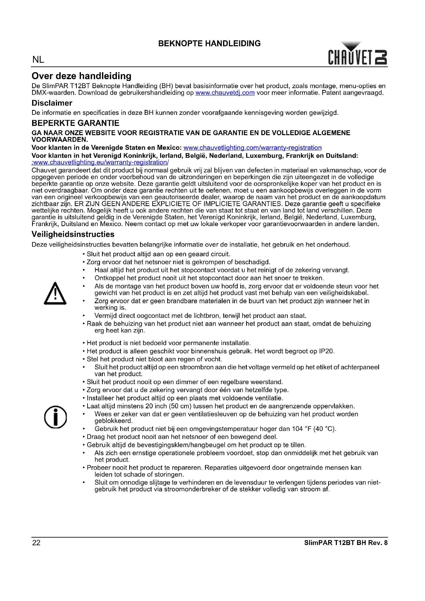 BEKNOPTE HANDLEIDING SlimPAR T12BT BH Rev. 8 Over deze handleiding De SlimPAR T12BT Beknopte Handleiding (BH) bevat basisinformatie over het product, zoals montage, menu-opties en DMX-waarden. Download de gebruikershandleiding op www.chauvetdj.com voor meer informatie. Patent aangevraagd. Disclaimer De informatie en specificaties in deze BH kunnen zonder voorafgaande kennisgeving worden gewijzigd. BEPERKTE GARANTIE GA NAAR ONZE WEBSITE VOOR REGISTRATIE VAN DE GARANTIE EN DE VOLLEDIGE ALGEMENE VOORWAARDEN. Voor klanten in de Verenigde Staten en Mexico: www.chauvetlighting.com/warranty-registration Voor klanten in het Verenigd Koninkrijk, Ierland, België, Nederland, Luxemburg, Frankrijk en Duitsland: :www.chauvetlighting.eu/warranty-registration/ Chauvet garandeert dat dit product bij normaal gebruik vrij zal blijven van defecten in materiaal en vakmanschap, voor de opgegeven periode en onder voorbehoud van de uitzonderingen en beperkingen die zijn uiteengezet in de volledige beperkte garantie op onze website. Deze garantie geldt uitsluitend voor de oorspronkelijke koper van het product en is niet overdraagbaar. Om onder deze garantie rechten uit te oefenen, moet u een aankoopbewijs overleggen in de vorm van een origineel verkoopbewijs van een geautoriseerde dealer, waarop de naam van het product en de aankoopdatum zichtbaar zijn. ER ZIJN GEEN ANDERE EXPLICIETE OF IMPLICIETE GARANTIES. Deze garantie geeft u specifieke wettelijke rechten. Mogelijk heeft u ook andere rechten die van staat tot staat en van land tot land verschillen. Deze garantie is uitsluitend geldig in de Verenigde Staten, het Verenigd Koninkrijk, Ierland, België, Nederland, Luxemburg, Frankrijk, Duitsland en Mexico. Neem contact op met uw lokale verkoper voor garantievoorwaarden in andere landen. Veiligheidsinstructies Deze veiligheidsinstructies bevatten belangrijke informatie over de installatie, het gebruik en het onderhoud.