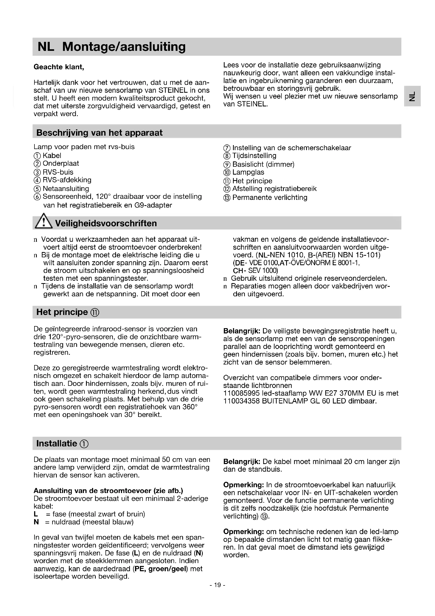 Uniquement pour les pays de l’UE: conformément à la directive européenne en vigueur relative aux appareils électriques et électroniques usagés et à son application dans le droit national, les appareils électriques qui ne fonctionnent plus doivent être collectés séparément des ordures ménagères et doivent faire l’objet d’un recycla- ge écologique. La lampe à détecteur est conçue pour allumer automati- quement la lumière. Les conditions atmosphériques peu- vent influencer le fonctionnement de la lampe à détecteur intégré car les fortes rafales de vent, la neige, la pluie ou la grêle peuvent provoquer un déclenchement intempestif, les variations brutales de température ne pouvant pas être différenciées des sources de chaleur. Si la lentille se salit, on la nettoiera avec un chiffon humide (ne pas utiliser de détergent). Le consommateur final peut remplacer lui-même la source lumineuse.- 19 - Installatie 햲 De plaats van montage moet minimaal 50 cm van een andere lamp verwijderd zijn, omdat de warmtestraling hiervan de sensor kan activeren. Aansluiting van de stroomtoevoer (zie afb.) De stroomtoevoer bestaat uit een minimaal 2-aderige kabel: L = fase (meestal zwart of bruin) N = nuldraad (meestal blauw) In geval van twijfel moeten de kabels met een span- ningstester worden geïdentificeerd; vervolgens weer spanningsvrij maken. De fase (L) en de nuldraad (N) worden met de steekklemmen aangesloten. Indien aanwezig, kan de aardedraad (PE, groen/geel) met isoleertape worden beveiligd. Het principe 햽 De geïntegreerde infrarood-sensor is voorzien van drie 120°-pyro-sensoren, die de onzichtbare warm- testraling van bewegende mensen, dieren etc. registreren. Deze zo geregistreerde warmtestraling wordt elektro- nisch omgezet en schakelt hierdoor de lamp automa- tisch aan. Door hindernissen, zoals bijv. muren of rui- ten, wordt geen warmtestraling herkend, dus vindt ook geen schakeling plaats. Met behulp van de drie pyro-sensoren wordt een registratiehoek van 360° met een openingshoek van 30° bereikt. Beschrijving van het apparaat Lamp voor paden met rvs-buis 햲 Kabel 햳 Onderplaat 햴 RVS-buis 햵 RVS-afdekking 햶 Netaansluiting 햷 Sensoreenheid, 120° draaibaar voor de instelling van het registratiebereik en G9-adapter NL Montage/aansluiting Geachte klant, Hartelijk dank voor het vertrouwen, dat u met de aan- schaf van uw nieuwe sensorlamp van STEINEL in ons stelt. U heeft een modern kwaliteitsproduct gekocht, dat met uiterste zorgvuldigheid vervaardigd, getest en verpakt werd. Veiligheidsvoorschriften n Voordat u werkzaamheden aan het apparaat uit- voert altijd eerst de stroomtoevoer onderbreken! n Bij de montage moet de elektrische leiding die u wilt aansluiten zonder spanning zijn. Daarom eerst de stroom uitschakelen en op spanningsloosheid testen met een spanningstester. n Tijdens de installatie van de sensorlamp wordt gewerkt aan de netspanning. Dit moet door een Lees voor de installatie deze gebruiksaanwijzing nauwkeurig door, want alleen een vakkundige instal- latie en ingebruikneming garanderen een duurzaam, betrouwbaar en storingsvrij gebruik. Wij wensen u veel plezier met uw nieuwe sensorlamp van STEINEL. vakman en volgens de geldende installatievoor- schriften en aansluitvoorwaarden worden uitge- voerd. (