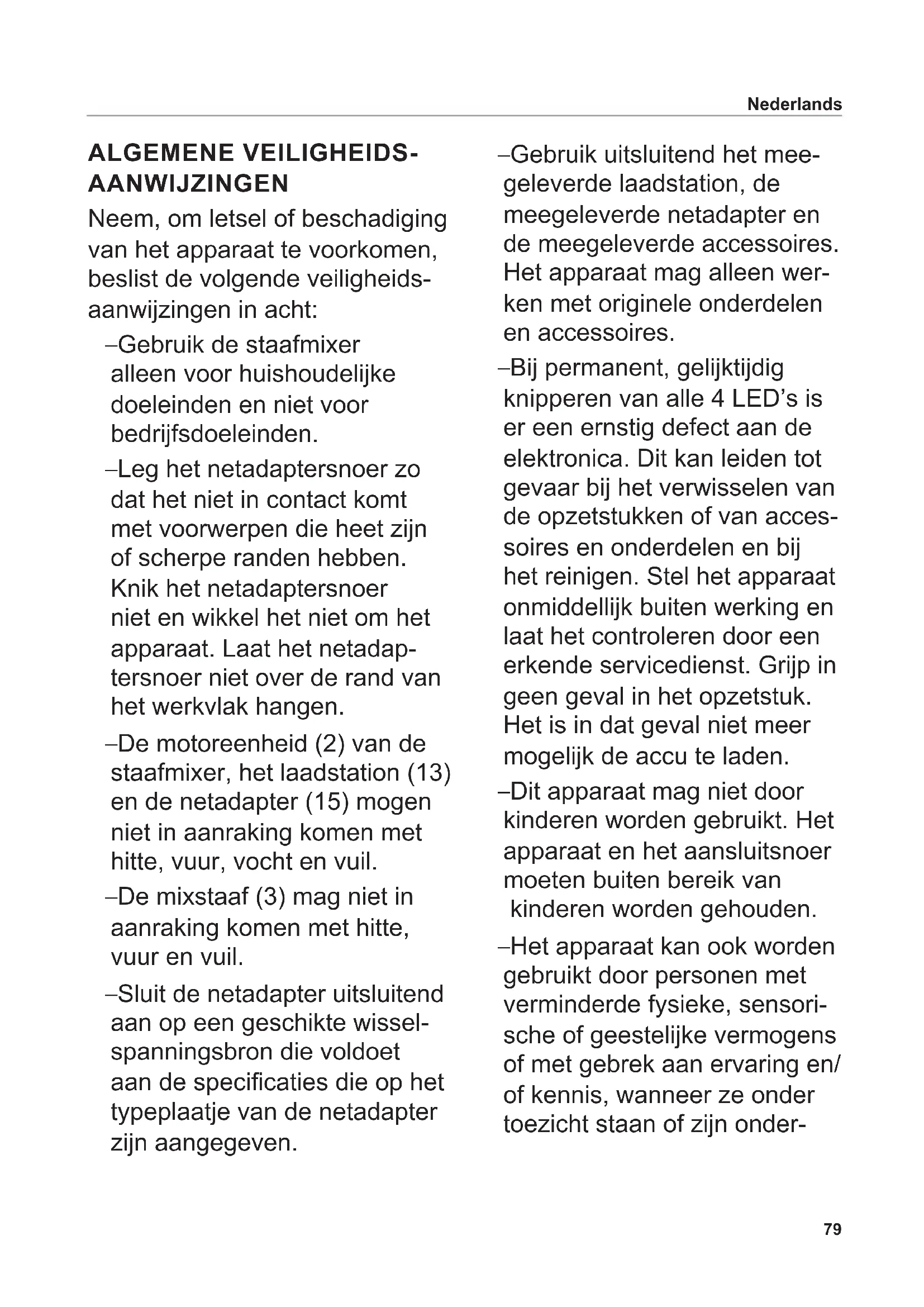 - Druk kort op de deblokkeringstoets (7). Het aantal brandende LED’s geeft de laadtoestand aan. REINIGEN VOORZICHTIG, gevaar voor letsel: – Houd de vingers weg van de toetsen. – De messen van de opzet- stukken zijn heel scherp! Pak de messen niet beet met blote handen. Nederlands Om te voorkomen dat bederfelijke restanten kunnen blijven zitten reinigt u de staafmixer (1) onmid- dellijk na elk gebruik grondig:
