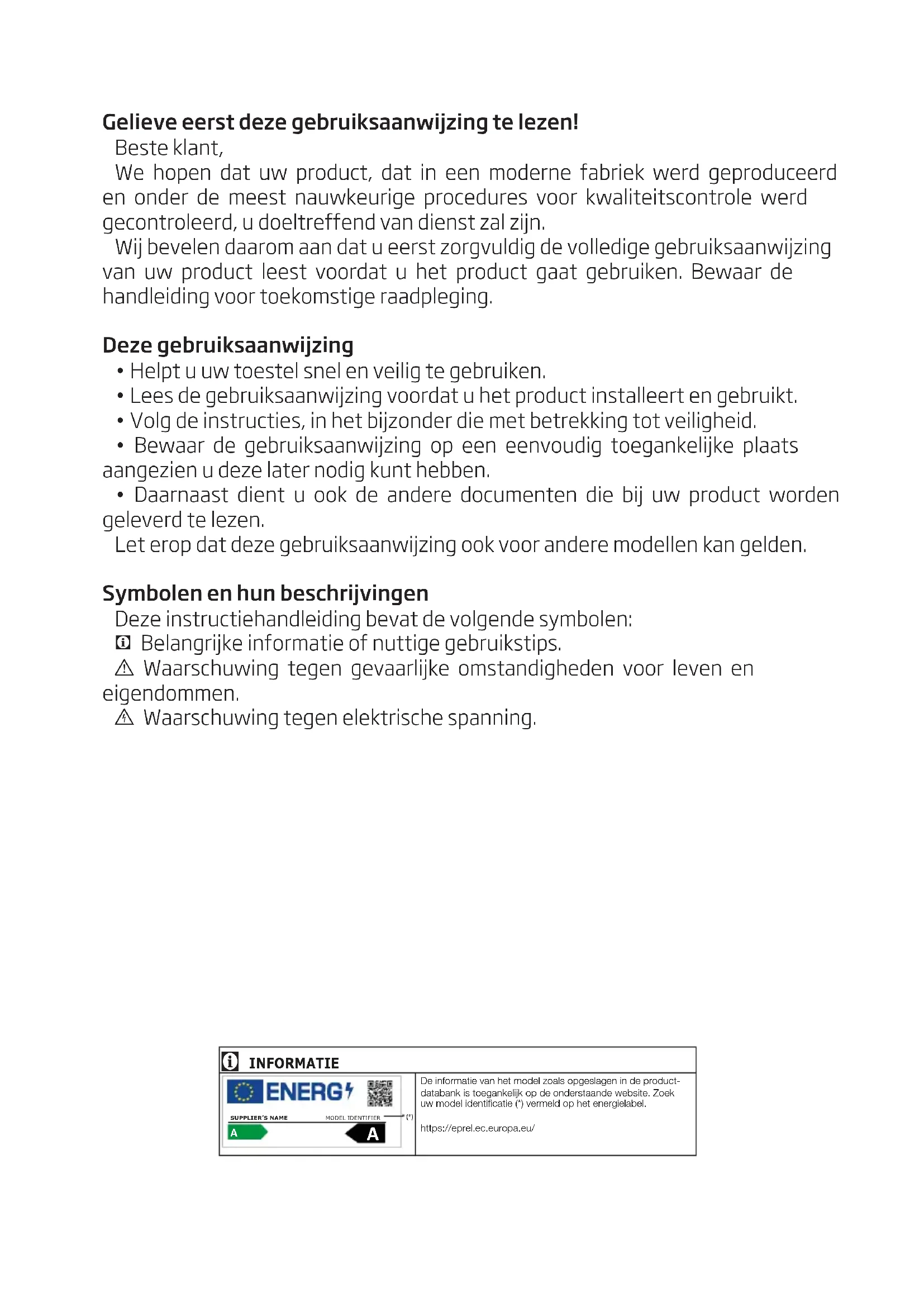 - Bewaar de gebruiksaanwijzing op een eenvoudig toegankelijke plaats aangezien u deze later nodig kunt hebben.