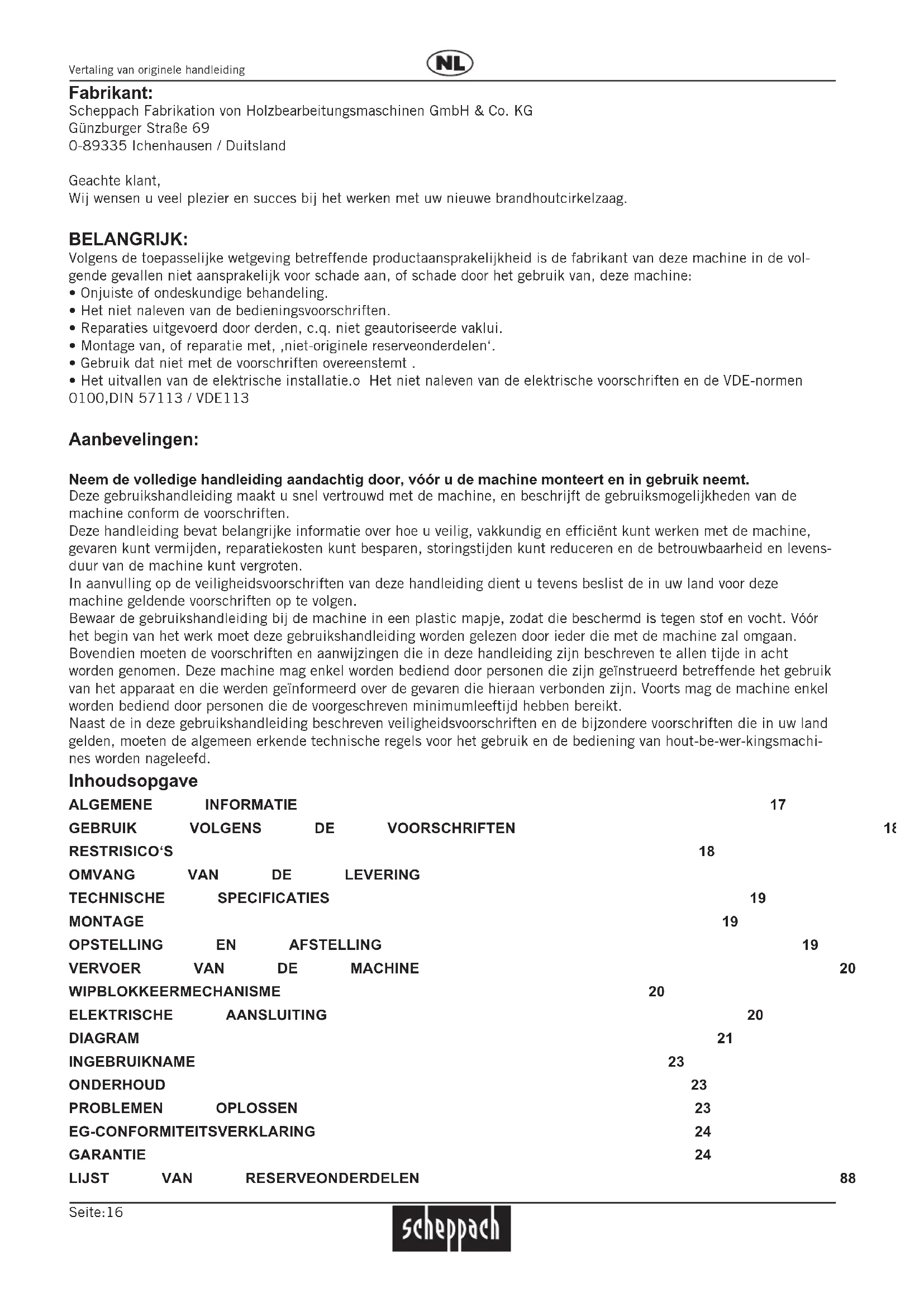 - Het uitvallen van de elektrische installatie.o Het niet naleven van de elektrische voorschriften en de VDE-normen 0100,DIN 57113 / VDE113 Aanbevelingen: Neem de volledige handleiding aandachtig door, vóór u de machine monteert en in gebruik neemt. Deze gebruikshandleiding maakt u snel vertrouwd met de machine, en beschrijft de gebruiksmogelijkheden van de machine conform de voorschriften. Deze handleiding bevat belangrijke informatie over hoe u veilig, vakkundig en efficiënt kunt werken met de machine, gevaren kunt vermijden, reparatiekosten kunt besparen, storingstijden kunt reduceren en de betrouwbaarheid en levens- duur van de machine kunt vergroten. In aanvulling op de veiligheidsvoorschriften van deze handleiding dient u tevens beslist de in uw land voor deze machine geldende voorschriften op te volgen. Bewaar de gebruikshandleiding bij de machine in een plastic mapje, zodat die beschermd is tegen stof en vocht. Vóór het begin van het werk moet deze gebruikshandleiding worden gelezen door ieder die met de machine zal omgaan. Bovendien moeten de voorschriften en aanwijzingen die in deze handleiding zijn beschreven te allen tijde in acht worden genomen. Deze machine mag enkel worden bediend door personen die zijn geïnstrueerd betreffende het gebruik van het apparaat en die werden geïnformeerd over de gevaren die hieraan verbonden zijn. Voorts mag de machine enkel worden bediend door personen die de voorgeschreven minimumleeftijd hebben bereikt. Naast de in deze gebruikshandleiding beschreven veiligheidsvoorschriften en de bijzondere voorschriften die in uw land gelden, moeten de algemeen erkende technische regels voor het gebruik en de bediening van hout-be-wer-kingsmachi- nes worden nageleefd. Inhoudsopgave ALGEMENE INFORMATIE 17