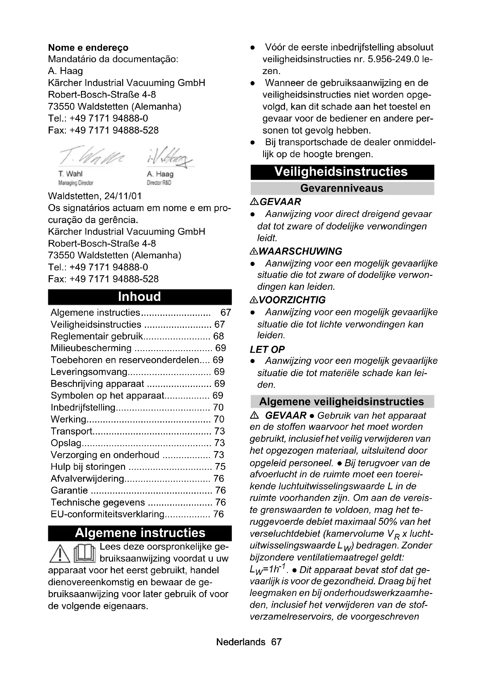Comprimento do cabo m 10Nederlands 67 Nome e endereço Mandatário da documentação: A. Haag Kärcher Industrial Vacuuming GmbH Robert-Bosch-Straße 4-8 73550 Waldstetten (Alemanha) Tel.: +49 7171 94888-0 Fax: +49 7171 94888-528 Waldstetten, 24/11/01 Os signatários actuam em nome e em pro- curação da gerência. Kärcher Industrial Vacuuming GmbH Robert-Bosch-Straße 4-8 73550 Waldstetten (Alemanha) Tel.: +49 7171 94888-0 Fax: +49 7171 94888-528 Inhoud Algemene instructies Lees deze oorspronkelijke ge- bruiksaanwijzing voordat u uw apparaat voor het eerst gebruikt, handel dienovereenkomstig en bewaar de ge- bruiksaanwijzing voor later gebruik of voor de volgende eigenaars. ● Vóór de eerste inbedrijfstelling absoluut veiligheidsinstructies nr. 5.956-249.0 le- zen. ● Wanneer de gebruiksaanwijzing en de veiligheidsinstructies niet worden opge- volgd, kan dit schade aan het toestel en gevaar voor de bediener en andere per- sonen tot gevolg hebben. ● Bij transportschade de dealer onmiddel- lijk op de hoogte brengen. Veiligheidsinstructies Gevarenniveaus GEVAAR ● Aanwijzing voor direct dreigend gevaar dat tot zware of dodelijke verwondingen leidt. 몇 WAARSCHUWING ● Aanwijzing voor een mogelijk gevaarlijke situatie die tot zware of dodelijke verwon- dingen kan leiden. 몇 VOORZICHTIG ● Aanwijzing voor een mogelijk gevaarlijke situatie die tot lichte verwondingen kan leiden. LET OP ● Aanwijzing voor een mogelijk gevaarlijke situatie die tot materiële schade kan lei- den. Algemene veiligheidsinstructies GEVAAR ● Gebruik van het apparaat en de stoffen waarvoor het moet worden gebruikt, inclusief het veilig verwijderen van het opgezogen materiaal, uitsluitend door opgeleid personeel. ● Bij terugvoer van de afvoerlucht in de ruimte moet een toerei- kende luchtuitwisselingswaarde L in de ruimte voorhanden zijn. Om aan de vereis- te grenswaarden te voldoen, mag het te- ruggevoerde debiet maximaal 50% van het verseluchtdebiet (kamervolume V
