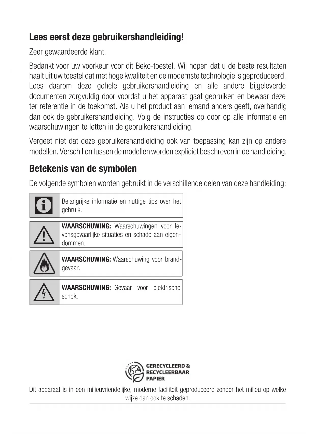 Belangrijke veiligheids- en milieu-instructies