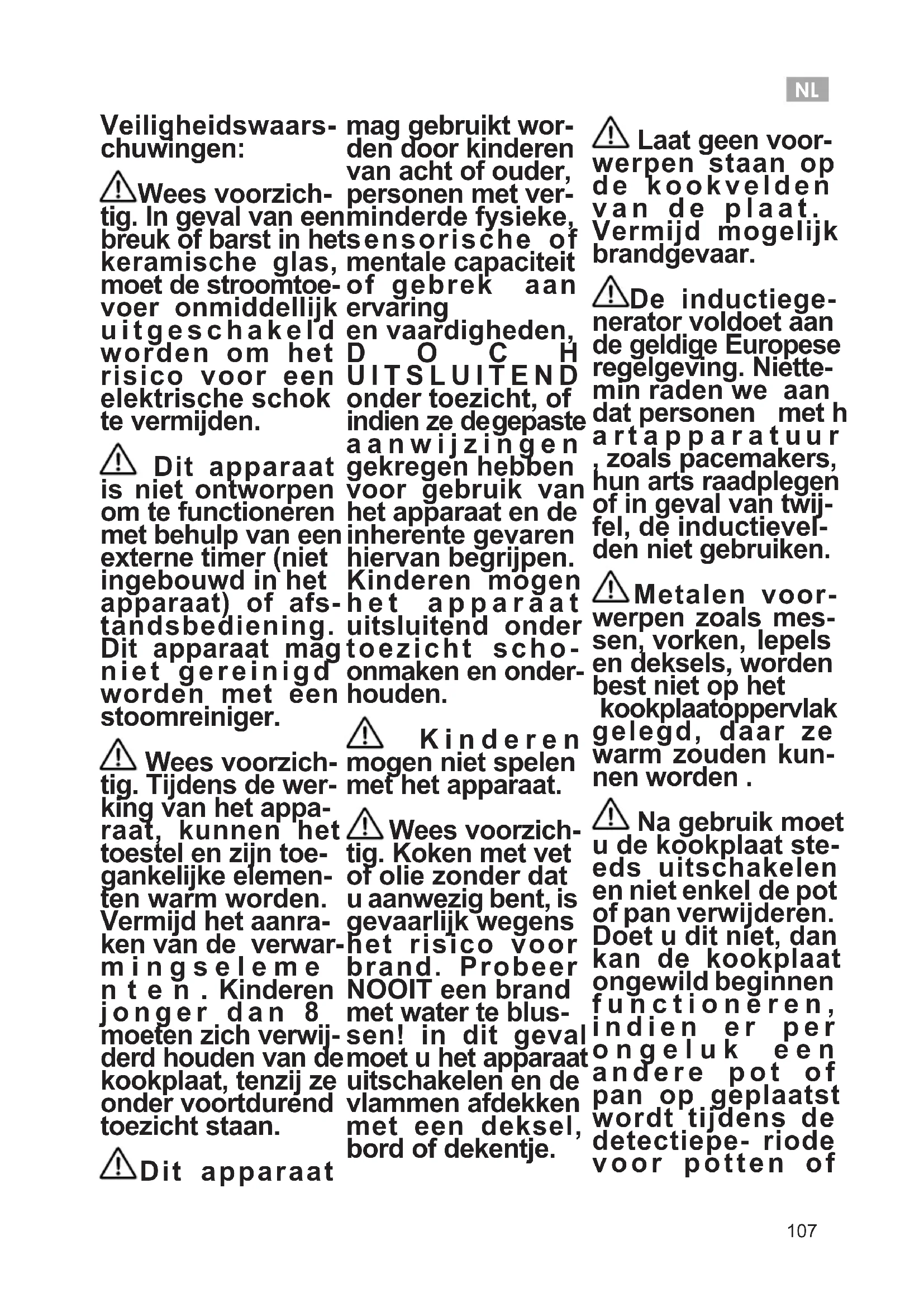 Veiligheidswaars- chuwingen: Wees voorzich- tig. In geval van een breuk of barst in het keramische glas, moet de stroomtoe- voer onmiddellijk uitgeschakeld worden om het risico voor een elektrische schok te vermijden. Dit apparaat is niet ontworpen om te functioneren met behulp van een externe timer (niet ingebouwd in het apparaat) of afs- tandsbediening. Dit apparaat mag niet gereinigd worden met een stoomreiniger. Wees voorzich- tig. Tijdens de wer- king van het appa- raat, kunnen het toestel en zijn toe- gankelijke elemen- ten warm worden. Vermijd het aanra- ken van de verwar- m i n g s e l e m e n t e n . Kinderen jonger dan 8 moeten zich verwij- derd houden van de kookplaat, tenzij ze onder voortdurend toezicht staan. Dit apparaat mag gebruikt wor- den door kinderen van acht of ouder, personen met ver- minderde fysieke, sensorische of mentale capaciteit of gebrek aan ervaring en vaardigheden, DOCH UITSLUITEND onder toezicht, of indien ze de gepaste aanwijzingen gekregen hebben voor gebruik van het apparaat en de inherente gevaren hiervan begrijpen. Kinderen mogen het apparaat uitsluitend onder toezicht scho- onmaken en onder- houden. Kinderen mogen niet spelen met het apparaat. Wees voorzich- tig. Koken met vet of olie zonder dat u aanwezig bent, is gevaarlijk wegens het risico voor brand. Probeer NOOIT een brand met water te blus- sen! in dit geval moet u het apparaat uitschakelen en de vlammen afdekken met een deksel, bord of dekentje. Laat geen voor- werpen staan op de kookvelden van de plaat. Vermijd mogelijk brandgevaar. De inductiege- nerator voldoet aan de geldige Europese regelgeving. Niette- min raden we aan dat personen met h a r t a p p a r a t u u r , zoals pacemakers, hun arts raadplegen of in geval van twij- fel, de inductievel- den niet gebruiken. Metalen voor- werpen zoals mes- sen, vorken, lepels en deksels, worden best niet op het kookplaatoppervlak gelegd, daar ze warm zouden kun- nen worden . Na gebruik moet u de kookplaat ste- eds uitschakelen en niet enkel de pot of pan verwijderen. Doet u dit niet, dan kan de kookplaat ongewild beginnen functioneren, indien er per ongeluk een andere pot of pan op geplaatst wordt tijdens de detectiepe- riode voor potten ofNL