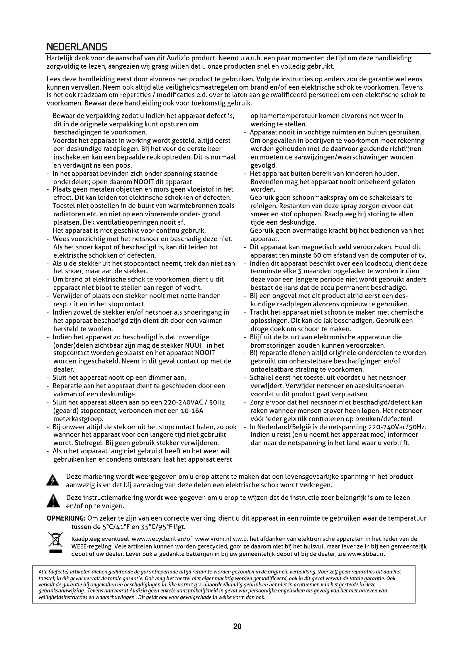 Alle (defecte) artikelen dienen gedurende de garantieperiode aktijd retour te worden gezonden in de origineverpakking. Voer zich geen reparaties uit aan het toestel; in elk geval verwalt de totale garantie. Ook mag het toestel Niet eigenmachtig worden gemodificerd, ook in dit geval verwalt de totale garantie. Ook verwalt de garantie bij oncegvallen en beschadigingen in etke vorm t.g.v. onoordeelkundig gebruik en het Niet in achtnemen van het gestelde in deze gebruiksanaanwijzing. Tevens aanvaardt Audizio gen nekele aansprakelijkheid in geval van personoolijke ongelukken als vegol van het nicht naleven van veiligheidsinstrumentes en waarschuwingen. Dit geldt ook voor gevolgschade in welke vorm dan ook.