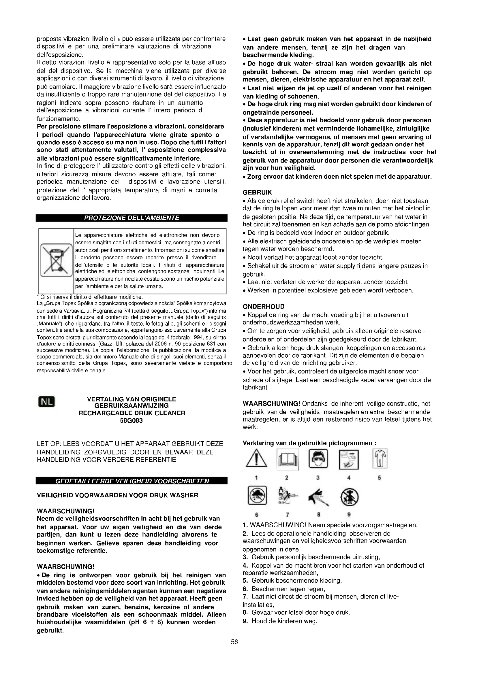 en de waarde van trilling versnelling een uur zijn is gemeten in overeenstemming met EN 60335-1. De opgegeven vibratie niveau een uur kan worden gebruikt om te vergelijken inrichtingen en voor een voorlopige beoordeling van trillingen blootstelling. De genoemde vibratie niveau is representatief alleen voor het fundamentele gebruik van de inrichting. Als de machine wordt gebruikt voor verschillende toepassingen of met andere werkzaamheden gereedschappen, de trilling niveau kan veranderen. De hogere vibratie niveau zal worden beïnvloed door onvoldoende of te zeldzaam onderhoud van de inrichting. De redenen gegeven bovenstaande kan resulteren in een verhoogde blootstelling aan trillingen gedurende de gehele duur van de operatie. Om nauwkeurig te schatten blootstelling aan trillingen, overwegen perioden wanneer de apparatuur wordt ingeschakeld uitgeschakeld of wanneer deze is ingeschakeld op, maar niet in gebruik. Nadat alle factoren zijn is zorgvuldig onderzocht, de algehele trilling blootstelling kan zijn beduidend lager. In het oog op de bescherming van de gebruiker tegen de effecten van trillingen, extra veiligheid maatregelen moeten worden uitgevoerd, zoals als: periodiek onderhoud van het apparaat en de werkende instrumenten, de bescherming van de juiste temperatuur van handen en een goede organisatie van het werk.59 MILIEUBESCHERMING