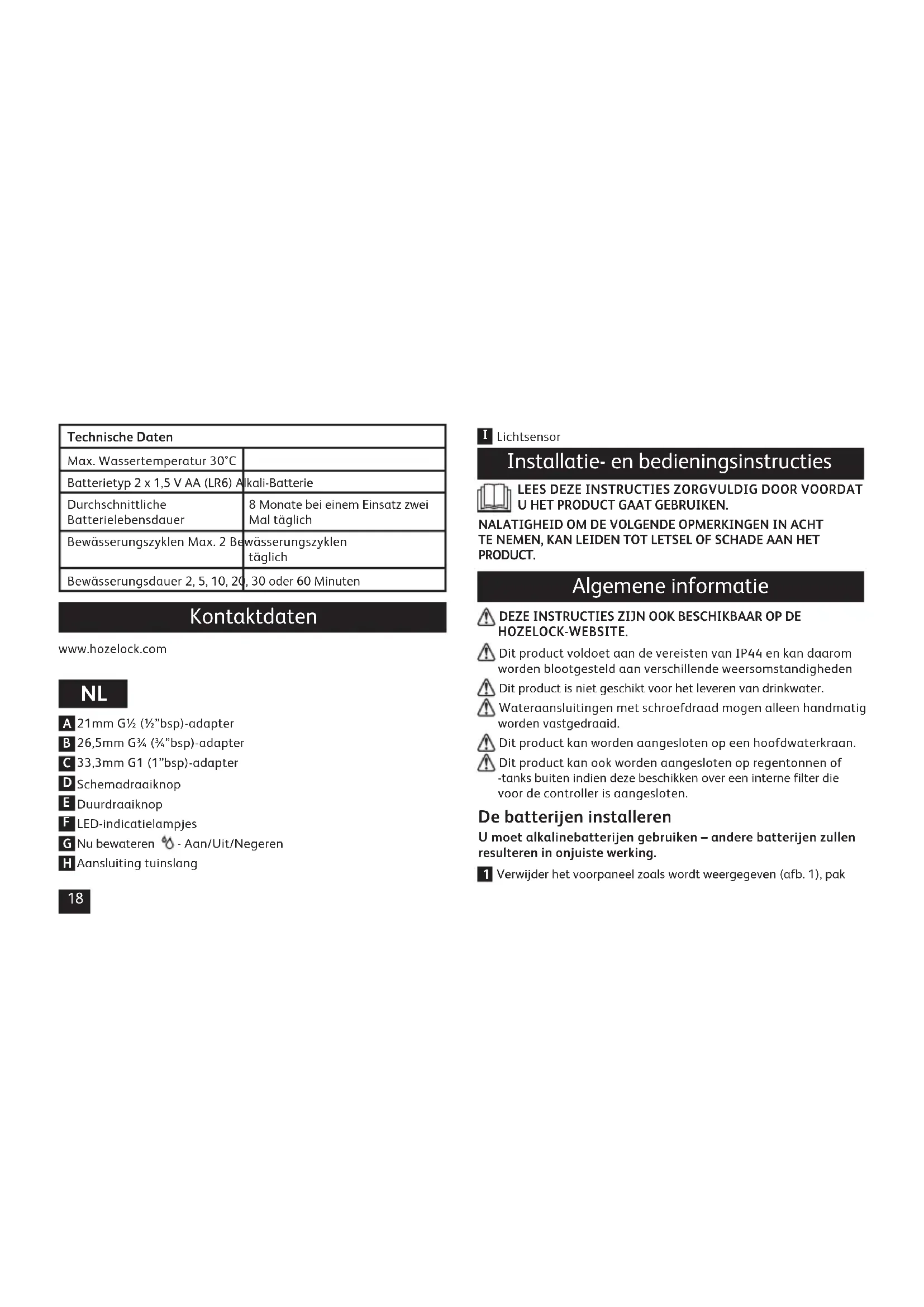 U HET PRODUCT GAAT GEBRUIKEN. NALATIGHEID OM DE VOLGENDE OPMERKINGEN IN ACHT TE NEMEN, KAN LEIDEN TOT LETSEL OF SCHADE AAN HET PRODUCT. Algemene informatie DEZE INSTRUCTIES ZIJN OOK BESCHIKBAAR OP DE HOZELOCK-WEBSITE. Dit product voldoet aan de vereisten van IP44 en kan daarom worden blootgesteld aan verschillende weersomstandigheden Dit product is niet geschikt voor het leveren van drinkwater. Wateraansluitingen met schroefdraad mogen alleen handmatig worden vastgedraaid. Dit product kan worden aangesloten op een hoofdwaterkraan. Dit product kan ook worden aangesloten op regentonnen of -tanks buiten indien deze beschikken over een interne filter die voor de controller is aangesloten. De batterijen installeren U moet alkalinebatterijen gebruiken – andere batterijen zullen resulteren in onjuiste werking.