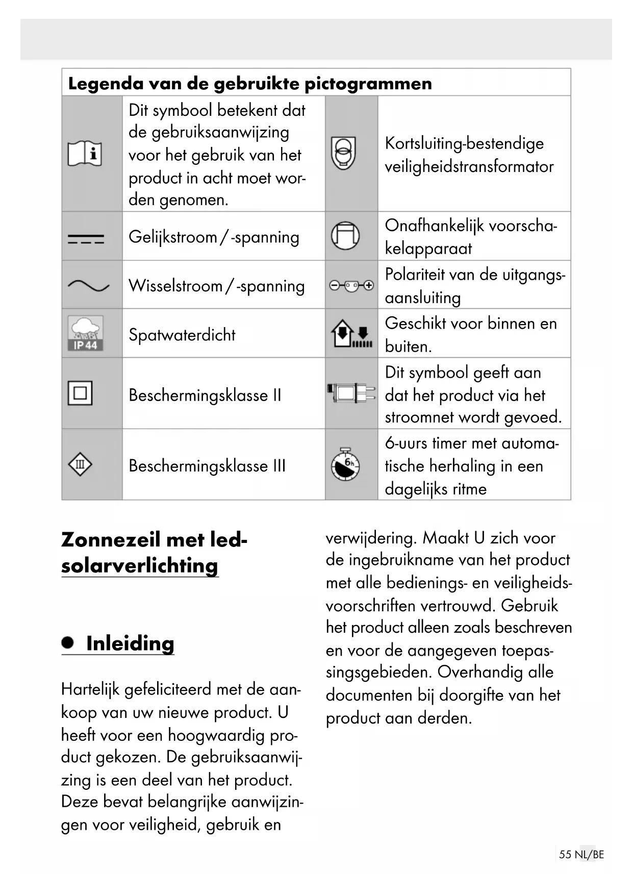 reuve d’achat pour toute deman de. Le numéro de référence de l’article est indiqué sur la plaque d’identifi- cation, gravé sur la page de titre de votre manuel (en bas à gauche) ou sur un autocollant apposé sur la face arrière ou inférieure du produit. En cas de dysfonctionnement du produit, ou de tout autre défaut, contactez en premier lieu le service après-vente par téléphone ou par e-mail aux coordonnées indiquées ci-dessous. Vous pouvez alors envoyer franco de port tout produit considéré comme défectueux au service clientèle indiqué, accompagné de la preuve d’achat (ticket de caisse) et d’une description écrite du défaut avec mention de sa date d’apparition. Service après-vente Service après-vente France Tél. : 0800904879 E-Mail : owim@lidl.fr Service après-vente Belgique Tél. : 080071011 Tél. : 80023970 (Luxembourg) E-Mail : owim@lidl.be54 NL/BE Legenda van de gebruikte pictogrammen ............... Pagina 55 Inleiding .................................................................................. Pagina 55 Correct en doelmatig gebruik................................................. Pagina 56 Beschrijving van de onderdelen ............................................. Pagina 56 Technische gegevens .............................................................. Pagina 56 Omvang van de levering ........................................................ Pagina 57 Veiligheids instructies ......................................................... Pagina 57 Veiligheidsin structies voor batterijen / accu‘s ........................ Pagina 60 Batterij plaatsen / vervangen ......................................... Pagina 61 Montage .................................................................................. Pagina 62 Product monteren .................................................................... Pagina 63 Gebruik.................................................................................... Pagina 64 Timer-functie (alleen voor gebruik met netadapter) ................................................................... Pagina 65 Product demonteren .......................................................... Pagina 65 Reiniging en onderhoud ................................................... Pagina 65 Storingen oplossen (voor gebruik met zonnepaneel) ............................................................... Pagina 66 Afvoer ...................................................................................... Pagina 67 Garantie .................................................................................. Pagina 68 Afwikkeling in geval van garantie .......................................... Pagina 69 Service...................................................................................... Pagina 6955 NL/BE Legenda van de gebruikte pictogrammen Dit symbool betekent dat de gebruiksaanwijzing voor het gebruik van het product in acht moet wor- den genomen. Kortsluiting-bestendige veiligheidstransformator Gelijkstroom / -spanning Onafhankelijk voorscha- kelapparaat Wisselstroom / -spanning Polariteit van de uitgangs- aansluiting Spatwaterdicht Geschikt voor binnen en buiten. Beschermingsklasse II Dit symbool geeft aan dat het product via het stroomnet wordt gevoed. Beschermingsklasse III 6-uurs timer met automa- tische herhaling in een dagelijks ritme Zonnezeil met led- solarverlichting Inleiding Hartelijk gefeliciteerd met de aan- koop van uw nieuwe product. U heeft voor een hoogwaardig pro- duct gekozen. De gebruiksaanwij- zing is een deel van het product. Deze bevat belangrijke aanwijzin- gen voor veiligheid, gebruik en verwijdering. Maakt U zich voor de ingebruikname van het product met alle bedienings- en veiligheids- voorschriften vertrouwd. Gebruik het product alleen zoals beschreven en voor de aangegeven toepas- singsgebieden. Overhandig alle documenten bij doorgifte van het product aan derden.56 NL/BE