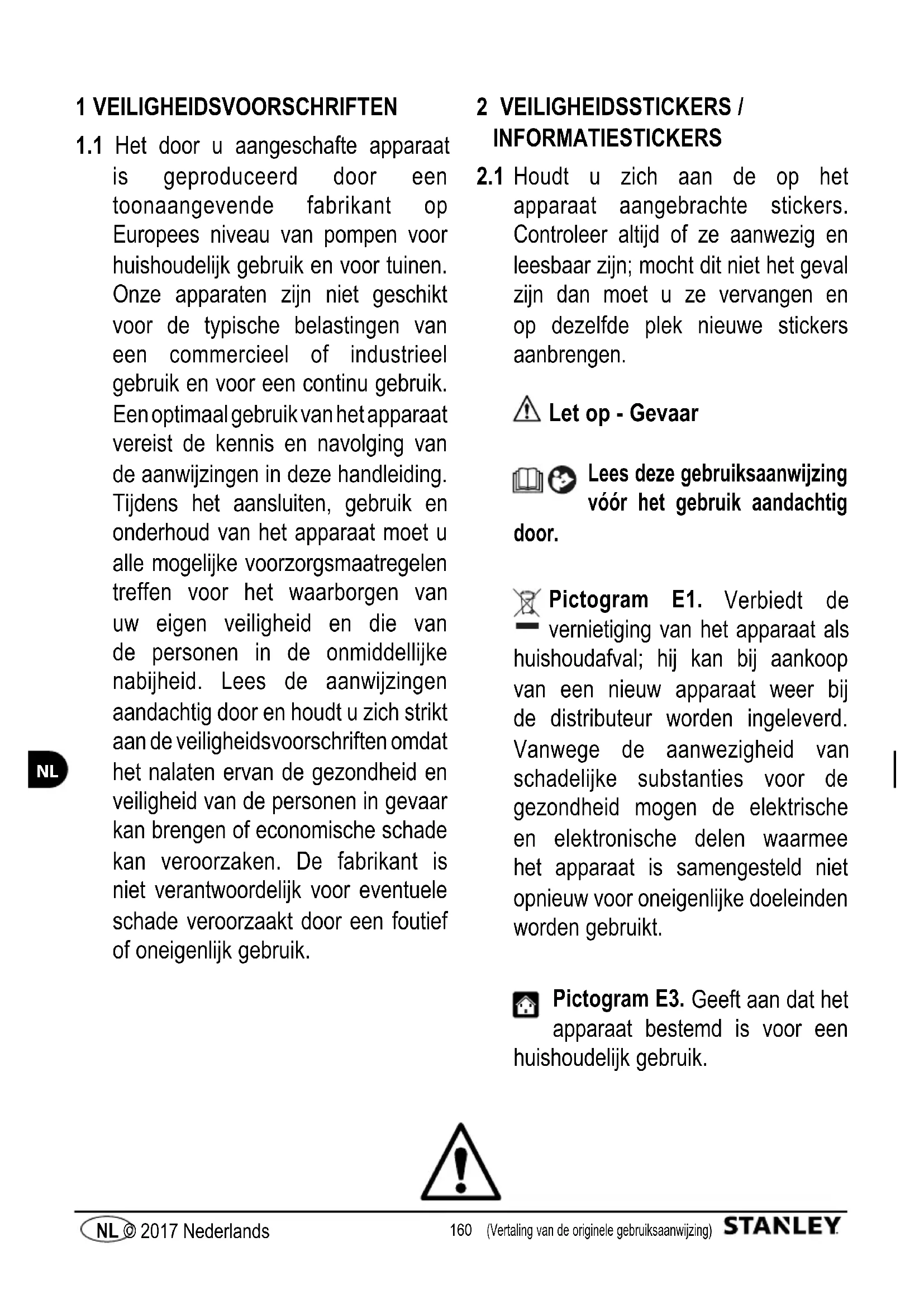Houdt u zich aan de op het apparaat aangebrachte stickers. Controleer altijd of ze aanwezig en leesbaar zijn; mocht dit niet het geval zijn dan moet u ze vervangen en op dezelfde plek nieuwe stickers aanbrengen. Let op - Gevaar Lees deze gebruiksaanwijzing vóór het gebruik aandachtig door. Pictogram E1. Verbiedt de vernietiging van het apparaat als huishoudafval; hij kan bij aankoop van een nieuw apparaat weer bij de distributeur worden ingeleverd. Vanwege de aanwezigheid van schadelijke substanties voor de gezondheid mogen de elektrische en elektronische delen waarmee het apparaat is samengesteld niet opnieuw voor oneigenlijke doeleinden worden gebruikt. Pictogram E3. Geeft aan dat het apparaat bestemd is voor een huishoudelijk gebruik.161 (Vertaling van de originele gebruiksaanwijzing) NL © 2017 Nederlands