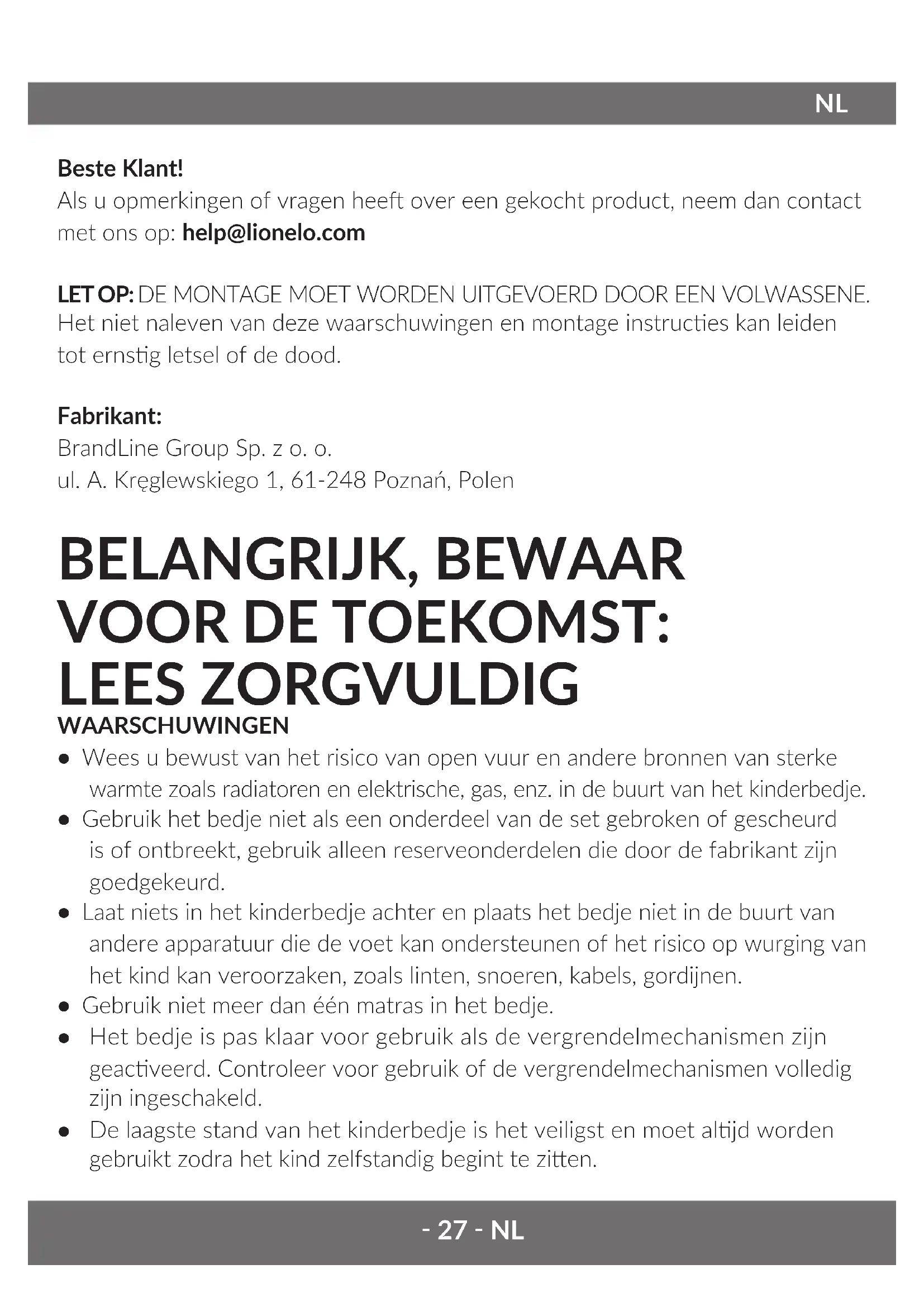Beste Klant! Als u opmerkingen of vragen hee over een gekocht product, neem dan contact met ons op: help@lionelo.com LET OP: DE MONTAGE MOET WORDEN UITGEVOERD DOOR EEN VOLWASSENE. Het niet naleven van deze waarschuwingen en montage instruces kan leiden tot ernsg letsel of de dood. Fabrikant: BrandLine Group Sp. z o. o. ul. A. Kręglewskiego 1, 61-248 Poznań, Polen BELANGRIJK, BEWAAR VOOR DE TOEKOMST: LEES ZORGVULDIG WAARSCHUWINGEN