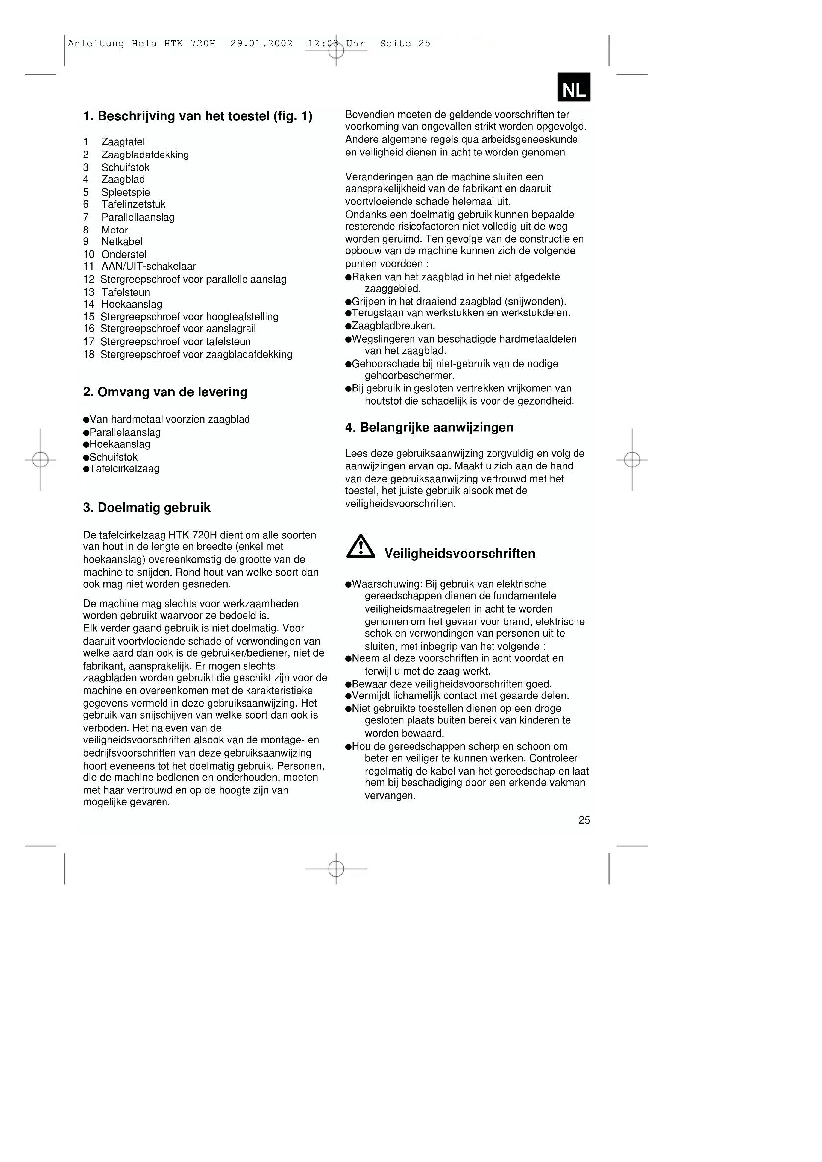 Anleitung Hela HTK 720H 29.01.2002 12:03 Uhr Seite 2526 Controleer verlengkabels regelmatig en vervang ze indien ze beschadigd zijn. Gebruik in open lucht enkel daarvoor toegelaten overeenkomstig gekenmerkte verlengkabels. Let er op wat u doet. Ga met verstand te werk. Gebruik het gereedschap niet als u moe bent. Gebruik geen gereedschappen waarvan de schakelaar niet kan worden in- of uitgeschakeld. Waarschuwing ! Het gebruik van andere inzetgereedschappen en andere accessoires kan voor u een gevaar voor verwondingen betekenen. Trek vóór elke afstel- en onderhoudswerkzaamheid de netstekker. Geef de veiligheidsvoorschriften aan alle personen door die aan de machine werken. Gebruik de zaag niet om brandhout te zagen. Laat het dwarszagen van rond hout achterwege. Voorzichtig ! Door het roterende zaagblad bestaat gevaar voor verwondingen aan handen en vingers. De machine is voorzien van een veiligheidsschakelaar (11) tegen herinschakelen na spanningsafval. Controleer of de spanning op het kenplaatje van het toestel overeenkomt met de netspanning alvorens met de zaagmachine te beginnen werken. Als u een verlengkabel nodig heeft dient u er zich van te vergewissen dat zijn doorsnede voldoende is voor het opgenomen vermogen van de zaag. Minimumdoorsnede 1 mm