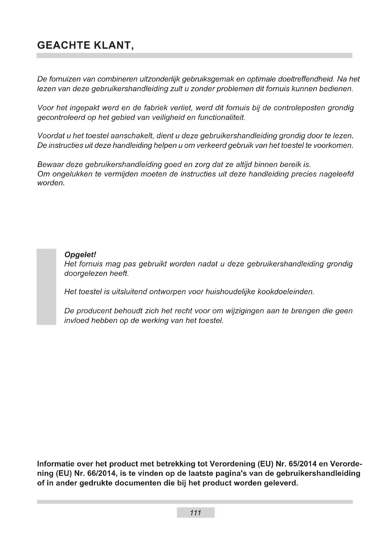 work. The bulb is loose or damaged. Tighten up or replace the blown bulb (see ‘Cleaning and Maintenance’).110 Voltage rating 230/400V~50 Hz Power rating max. 10,3 kW Cooker dimensions H/W/D 59,5 / 59,5 / 57,5 cm TECHNICAL DATA Certicate of compliance CE The Manufacturer hereby declares that this product complies with the general requirements pursuant to the following European Directives: The Low Voltage Directive 2014/35/EC, Electromagnetic Compatibility Directive 2014/30/EC, ErP Directive 2009/125/EC, and therefore the product has been marked with the symbol and the Declaration of Conformity has been issued to the manufacturer and is available to the competent authorities regulating the market. Basic Information: The product meets the requirements of European standards EN 60335- 1; EN60335-2-6. The data on the energy labels of electric ovens is given according to standard EN 60350-1 / IEC 60350-1. These values are dened with a standard workload a with the functions active: bottom and top heaters (conventional heating) and fan assisted heating (forced air heating), if these functions are available. The energy eciency class was assigned depending on the function available in the product in accordance with the priority below: During energy consumption test, remove the telescopic runners (if the product is tted with any). Forced air circulation ECO (ring heater + fan) Forced air circulation ECO (bottom heater + top + roaster + fan) Conventional mode ECO (bottom heater + top) Power consumption in standby mode [W] 0,5 Power consumption in o -mode [W] - Power consumption in networked standby mode [W] - Automatic standby/o time [min] -111 GEACHTE KLANT, De fornuizen van combineren uitzonderlijk gebruiksgemak en optimale doeltreendheid. Na het lezen van deze gebruikershandleiding zult u zonder problemen dit fornuis kunnen bedienen. Voor het ingepakt werd en de fabriek verliet, werd dit fornuis bij de controleposten grondig gecontroleerd op het gebied van veiligheid en functionaliteit. Voordat u het toestel aanschakelt, dient u deze gebruikershandleiding grondig door te lezen. De instructies uit deze handleiding helpen u om verkeerd gebruik van het toestel te voorkomen. Bewaar deze gebruikershandleiding goed en zorg dat ze altijd binnen bereik is. Om ongelukken te vermijden moeten de instructies uit deze handleiding precies nageleefd worden. Opgelet! Het fornuis mag pas gebruikt worden nadat u deze gebruikershandleiding grondig doorgelezen heeft. Het toestel is uitsluitend ontworpen voor huishoudelijke kookdoeleinden. De producent behoudt zich het recht voor om wijzigingen aan te brengen die geen invloed hebben op de werking van het toestel. Informatie over het product met betrekking tot Verordening (EU) Nr. 65/2014 en Verorde- ning (EU) Nr. 66/2014, is te vinden op de laatste pagina's van de gebruikershandleiding of in ander gedrukte documenten die bij het product worden geleverd. NL112 VEILIGHEIDSINSTRUCTIES Attentie. Dit apparaat en de bereikbare onderdelen ervan worden tijdens het gebruik heet. Wees bijzonder voorzich- tig bij het aanraken van de verwarmingselementen. Zorg dat kinderen die jonger zijn dan 8 jaar niet bij het apparaat kunnen komen, tenzij ze onder permanent toezicht staan. Dit apparaat mag gebruikt worden door kinderen van 8 jaar en ouder en personen met lichamelijke of geestelijke beperkingen of personen zonder ervaring met of kennis van het apparaat, als dit gebruik plaatsvindt onder toezicht of in overeenstemming met de gebruiksaanwijzing van het apparaat, door personen die verantwoordelijk zijn voor hun veiligheid. Zorg ervoor dat kinderen niet met het apparaat kunnen spelen. Kinderen mogen de kookplaat niet zonder toezicht schoonmaken of onderhoudswerkzaamheden ver- richten. Attentie. Het koken van vetten of olie op de kookplaat zonder toezicht kan erg gevaarlijk zijn en leiden tot brand. Probeer het vuur NOOIT met water te blussen, maar schakel het apparaat uit en bedek de vlammen met een deksel of een niet-brandbare deken. Attentie. Brandgevaar: geen voorwerpen verzamelen op de kookoppervlakte. Attentie. Schakel de stroom uit als de oppervlakte is gebar- sten, om elektrische schokken te voorkomen.113 VEILIGHEIDSINSTRUCTIES Tijdens het gebruik wordt het toestel heet. Wees voorzichtig en raak de hete onderdelen in de oven niet aan. Als dit apparaat gebruikt wordt, kunnen de bereikbare onder- delen heet worden. Laat geen kinderen bij de oven komen. Attentie. Gebruik geen schurende schoonmaakmiddelen of scherpe metalen voorwerpen voor het schoonmaken van het glas van de deur, omdat deze krassen kunnen veroorzaken op het oppervlak. Dit kan leiden tot barsten van het glas. Attentie. Om elektrocutie te vermijden dient u het toestel uit te schakelen vooraleer u het lampje vervangt. Gebruik geen stoomreinigers voor het schoonmaken van het fornuis. Gevaar voor verbranding! Bij het openen van de ovendeur kan hete stoom ontsnappen. Wees voorzichtig met het ope- nen van de deur tijdens of na aoop van het koken. Buig u bij het openen niet over de deur. Vergeet niet dat stoom bij bepaalde temperaturen onzichtbaar kan zijn.114 VEILIGHEIDSINSTRUCTIES ● Wees bijzonder voorzichtig als er kinderen in de buurt van het fornuis zijn, want ze kennen de bedieningsprincipes van het fornuis niet. De hete branders van de gaskookplaat, de ovenkamer, het rooster, de ruit van de deur, en potten en pannen met hete vloeistoen kunnen brandwonden veroorzaken! ● Zorg ervoor dat er geen kleine keukentoestellen of hun kabels in direct contact komen met de hete oven of de kookplaat, want de isolatie van deze toestellen is niet bestand tegen hoge temperaturen. ● Laat het fornuis niet achter zonder toezicht terwijl u kookt. Oliën en vetten kunnen ont- vlammen als gevolg van oververhitting of overkoken. ● Zorg ervoor dat de kookplaat niet vuil wordt of onderloopt door overlopende spijzen. Eventueel vuil moet onmiddellijk verwijderd worden. ● Plaats geen potten of pannen met een natte bodem op de 