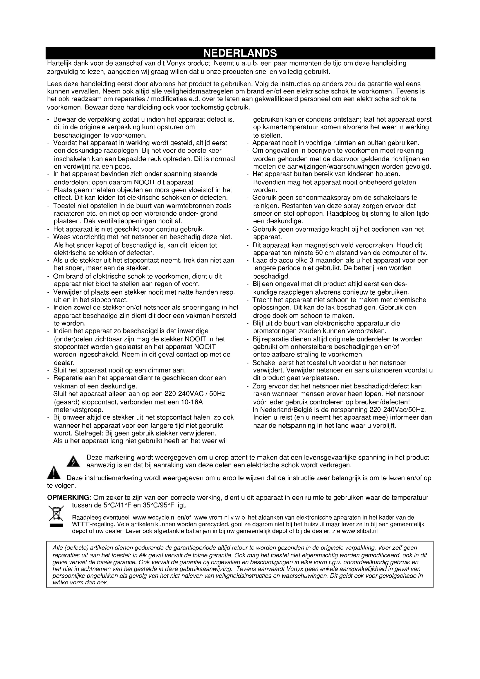 Deze markering wordt weergegeven om u erop attent te maken dat een levensgevaarlijke spanning in het product aanwezig is en dat bij aanraking van deze delen een elektrische schok wordt verkregen. Deze instructiemarkering wordt weergegeven om u erop te wijzen dat de instructie zeer belangrijk is om te lezen en/of op te volgen. OPMERKING: Om zeker te zijn van een correcte werking, dient u dit apparaat in een ruimte te gebruiken waar de temperatuur tussen de 5°C/41°F en 35°C/95°F ligt. Raadpleeg eventueel www.wecycle.nl en/of www.vrom.nl v.w.b. het afdanken van elektronische apparaten in het kader van de WEEE-regeling. Vele artikelen kunnen worden gerecycled, gooi ze daarom niet bij het huisvuil maar lever ze in bij een gemeentelijk depot of uw dealer. Lever ook afgedankte batterijen in bij uw gemeentelijk depot of bij de dealer, zie www.stibat.nl