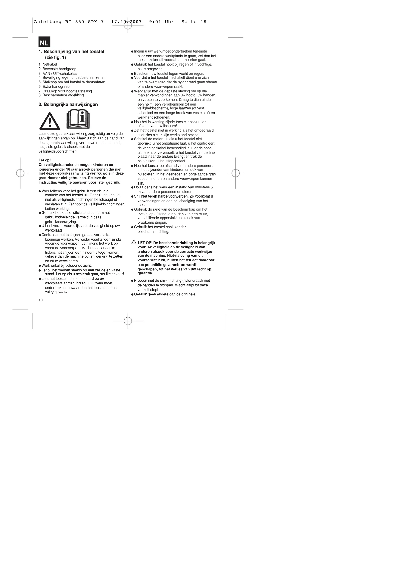 Anleitung RT 350 SPK 7 17.10.2003 9:01 Uhr Seite 1819 nylondraad. Gebruik i.p.v. de nylondraad in geen geval metalen draden. Wees voorzichtig tegen verwondingen aan de inrichting die dient om de draadlengte af te snijden. Let er goed op dat de luchtopeningen vrij zijn van verontreinigingen. Trek na gebruik de netstekker uit het stopcontact en controleer de machine op beschadiging. Probeer niet met het toestel gras te snijden dat niet op de grond groeit; probeer b.v. niet gras te snijden dat op muren of stenen enz. groeit. Binnen het werkgebied van de grastrimmer is de gebruiker verantwoordelijk tegenover derden voor schade berokkend door het gebruik van het toestel. Steek met ingeschakeld toestel geen wegen of grindpaden over. Als u het toestel niet gebruikt bewaar het op een droge en voor kinderen onbereikbare plaats. Gebruik het toestel enkel op de manier beschreven in deze gebruiksaanwijzing en hou het altijd loodrecht t.o.v. de grond. Elke andere stand is gevaarlijk. Controleer regelmatig of de schroeven naar behoren zijn aangehaald. De netspanning moet overeenstemmen met de spanning vermeld op het kenplaatje. De aansluitkabel dient regelmatig op tekens van beschadiging of veroudering te worden gecontroleerd. Het toestel mag niet gebruikt worden als de aansluitkabel niet in perfecte staat is. De gebruikte aansluitkabels mogen niet lichter zijn dan lichte rubberslangkabels HO7RN-F volgens DIN 282/VDE 0282 en moeten een minimumdiameter van 1,5 mm