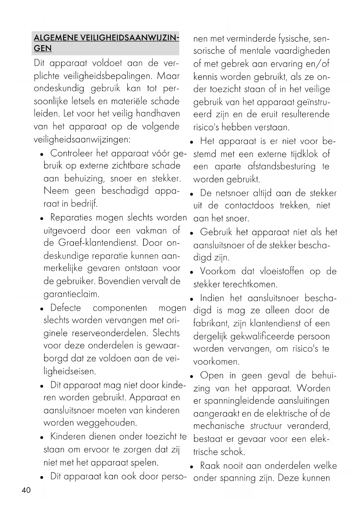- 2 jaar motorgarantie ALGEMENE VEILIGHEIDSAANWIJZIN- GEN Dit apparaat voldoet aan de ver- plichte veiligheidsbepalingen. Maar ondeskundig gebruik kan tot per- soonlijke letsels en materiële schade leiden. Let voor het veilig handhaven van het apparaat op de volgende veiligheidsaanwijzingen: ● Controleer het apparaat vóór ge- bruik op externe zichtbare schade aan behuizing, snoer en stekker. Neem geen beschadigd appa- raat in bedrijf. ● Reparaties mogen slechts worden uitgevoerd door een vakman of de Graef-klantendienst. Door on- deskundige reparatie kunnen aan- merkelijke gevaren ontstaan voor de gebruiker. Bovendien vervalt de garantieclaim. ● Defecte componenten mogen slechts worden vervangen met ori- ginele reserveonderdelen. Slechts voor deze onderdelen is gewaar- borgd dat ze voldoen aan de vei- ligheidseisen. ● Dit apparaat mag niet door kinde- ren worden gebruikt. Apparaat en aansluitsnoer moeten van kinderen worden weggehouden. ● Kinderen dienen onder toezicht te staan om ervoor te zorgen dat zij niet met het apparaat spelen. ● Dit apparaat kan ook door perso- nen met verminderde fysische, sen- sorische of mentale vaardigheden of met gebrek aan ervaring en/of kennis worden gebruikt, als ze on- der toezicht staan of in het veilige gebruik van het apparaat geïnstru- eerd zijn en de eruit resulterende risico's hebben verstaan. ● Het apparaat is er niet voor be- stemd met een externe tijdklok of een aparte afstandsbesturing te worden gebruikt. ● De netsnoer altijd aan de stekker uit de contactdoos trekken, niet aan het snoer. ● Gebruik het apparaat niet als het aansluitsnoer of de stekker bescha- digd zijn. ● Voorkom dat vloeistoffen op de stekker terechtkomen. ● Indien het aansluitsnoer bescha- digd is mag ze alleen door de fabrikant, zijn klantendienst of een dergelijk gekwalificeerde persoon worden vervangen, om risico's te voorkomen. ● Open in geen geval de behui- zing van het apparaat. Worden er spanningleidende aansluitingen aangeraakt en de elektrische of de mechanische structuur veranderd, bestaat er gevaar voor een elek- trische schok. ● Raak nooit aan onderdelen welke onder spanning zijn. Deze kunnen41 p. 5040